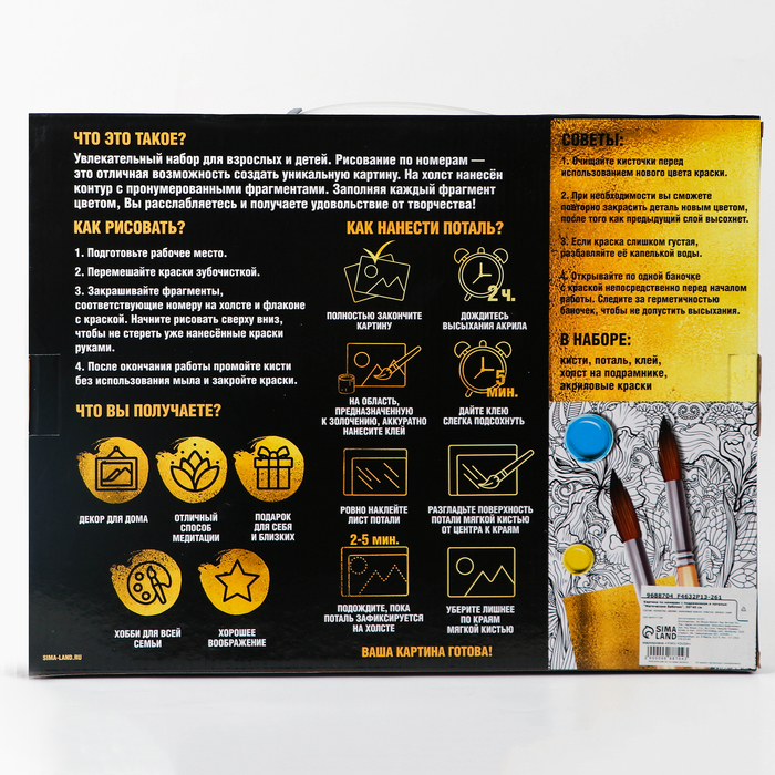 Габариты: 31 x 21 x 2,5 Страна: Китай В боксе: 50 шт Состав: Акриловые краски, дерево, клей, металл, пластик, полиэстер Материалы: акриловые краски, дерево, клей, металл, пластик, полиэстер Фасовка: по 1 шт Индивидуальная упаковка: Картонная коробка / упаковка Габариты товара: 31 см × 21 см × 2,4 см Сертификат: Не подлежит сертификации Для кого: Унисекс Размер, см: 20 х 30 Возраст: От 7 лет Тематика: Подводный мир Ориентация изображения: Вертикально Вид: Холст под роспись Уровень сложности: Средний Комплектация набора: С красками, С кистью (-ями) Набор для рисования станет находкой для людей, которые хотят творить! Специально разработанная уникальная серия росписи по номерам станет верным помощником начинающим художникам, с помощью которой они будут создавать настоящие шедевры изобразительного искусства! Написанная своими руками картина украсит интерьер или станет прекрасным подарком для родных и близких людей. Картина по номерам с подрамником и поталью «Золотые рыбки», 20×30 см понравится и детям, и взрослым. Холст разделён на множество мелких фрагментов, на каждом из которых указано число, соответствующее цвету, которым нужно закрасить данный участок. В набор входят все необходимые оттенки красок, каждый из которых пронумерован. Поначалу, когда вы только возьмёте холст в руки, будет сложно представить, что за чудесная картина получится в итоге! Но уверяем вас, результат превзойдёт все ожидания. Полотно с множеством оттенков, теней и красок будет выглядеть так, словно оно из музея. Раскрашивание по номерам покорило сердца миллионов людей по всему миру, ведь с ним каждый может создать шедевр! Присоединяйтесь к этому увлекательному занятию, творите и наслаждайтесь результатами. Комментарии к товару