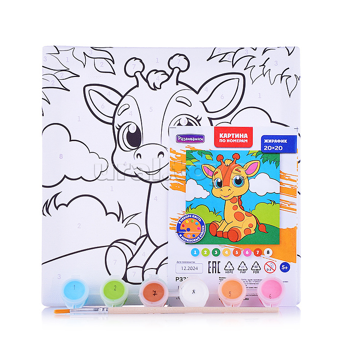 • В наборе: - холст на деревянном подрамнике с нанесённым контуром рисунка (20х20 см.); - акриловые краски (8 цветов); - кисть. • Материал: дерево, металл, хлопок, акрил, бумага, пластик. • Упаковка: термоплёнка. • Соответствует требованиям безопасности продукции. • Для детей от 5-х лет.