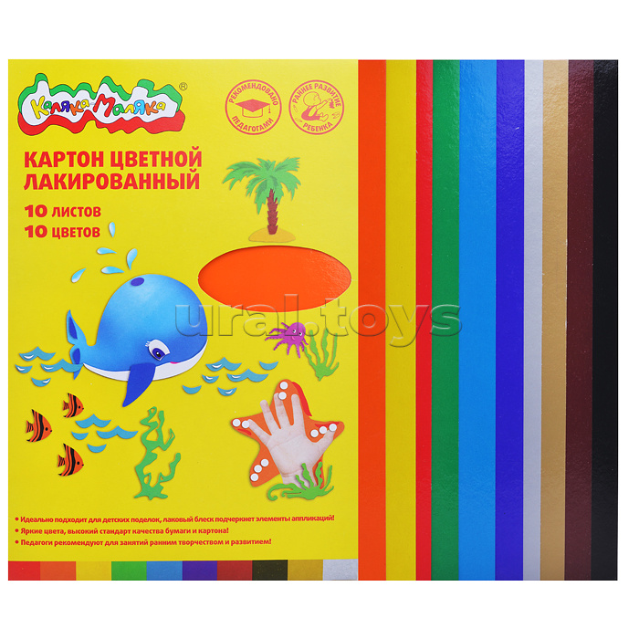 В линейке материалов для аппликаций Каляка-Маляка появилась яркая новинка – цветной картон, покрытый глянцевым лаком. Картон предназначен для поделок и аппликаций, рекомендован детям с 3-х лет. В наборе 10 листов формата А4, помимо основных, добавлены серебряный и золотой цвета. Материал плотный, равномерно прокрашеннный, цвета насыщенные. Картон легко клеится благодаря оборотной немелованной стороне, режется ножницами без усилий, не крошится. Листы упакованы в удобную жёсткую папку-конверт с вырубным окном Повышенная плотность и гибкость: складывается, образуя аккуратные сгибы, легко приклеивается. Глянцевый акцент на деталях Насыщенные цвета, равномерный прокрас Знакомство с цветом и фактурой Яркий дизайн мотивирует к занятиям творчеством!