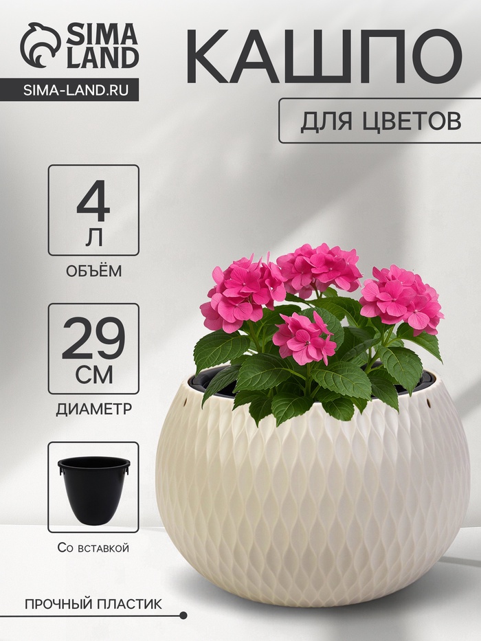 Теплое бежевое кашпо объемом 4 литра из качественного пластика. Изящная округлая форма с практичной вставкой создает гармоничный образ. Идеально подходит для размещения на столах, подоконниках и других горизонтальных поверхностях.