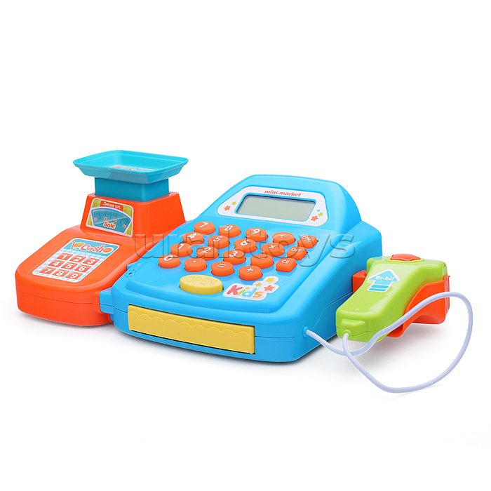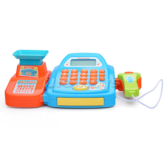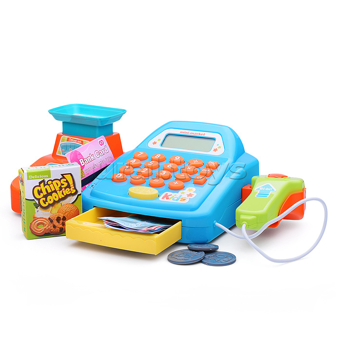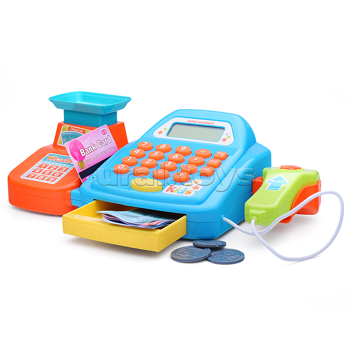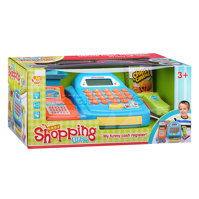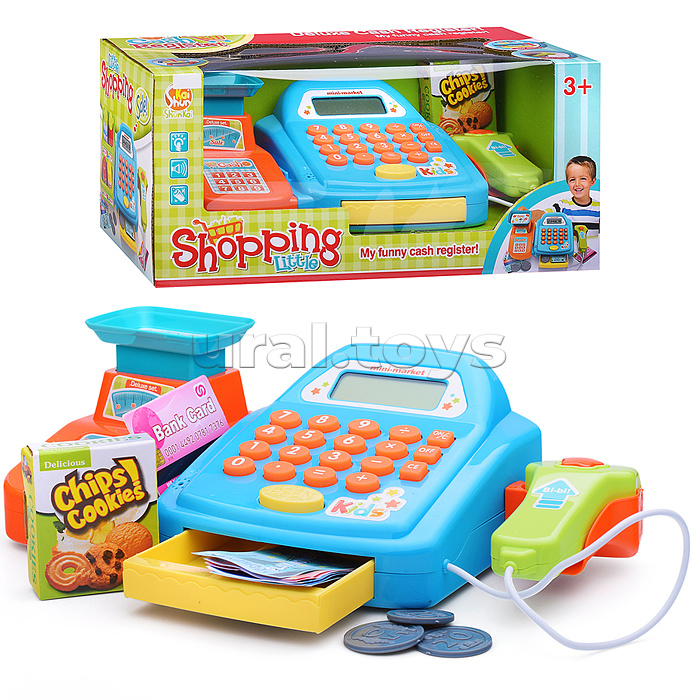 Код: 472667 Страна производитель: Китай Размеры упаковки: 33 x 16 x 15 см Количество в коробке: 18 • Размеры кассы (ДхШхВ): 27.5х14.5х8.5 см. • В комплекте: - коробка. - пластиковые монеты (6 шт.) - бумажные купюры (6 шт.) - картонная карта (2 шт.) • Функции кассы: - денежный ящик открывается с кнопки "OPEN". - встроенный калькулятор с электронным дисплеем. - мягкие кнопки кассы при нажатии звучит писк. - при нажатии кнопки сканера звучит писк. • Для работы кассы нужны 2 батарейки "АА" (не входят в комплект). • Материалы: пластик, картон, бумага. • Соответствует требованиям безопасности и стандартам качества продукции. • Для детей от 3-х лет. Комментарии к товару