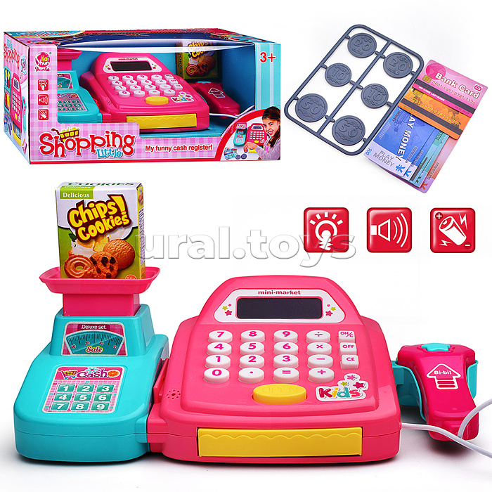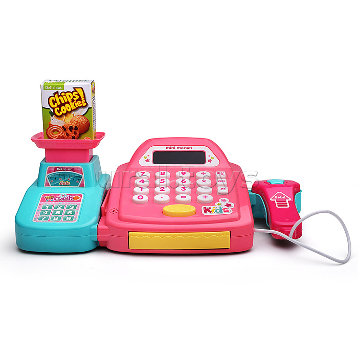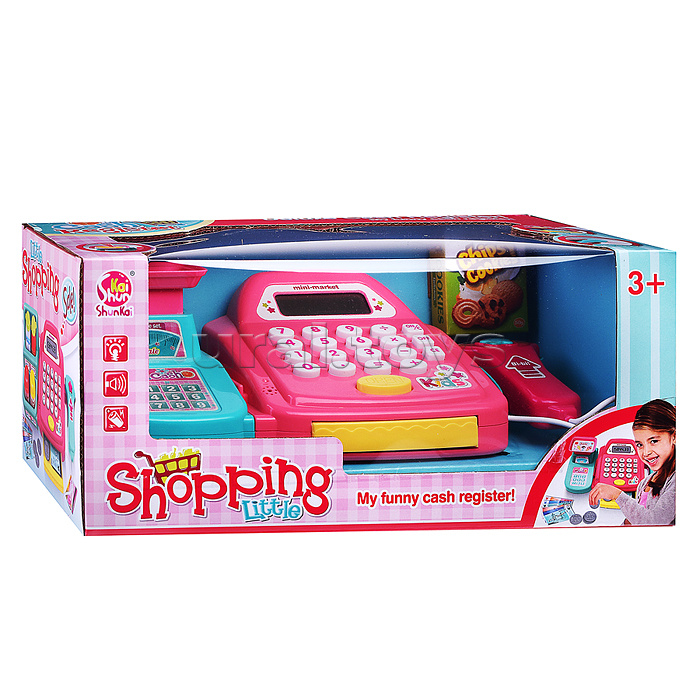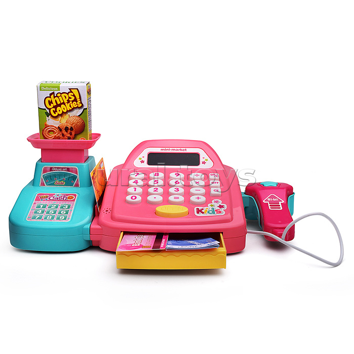 Код: 505304 Штрихкод: 6904110665620 Страна производитель: Китай Размеры упаковки: 33 x 16 x 15 см Количество в коробке: 18 • Размеры кассы (ДхШхВ): 28х14х8 см. • В комплекте: - коробка. - пластиковые монеты (6 шт.) - бумажные купюры (6 шт.) - картонная карта (2 шт.) • Функции кассы: - денежный ящик открывается с кнопки "OPEN". - встроенный калькулятор с электронным дисплеем. - мягкие кнопки кассы при нажатии звучит писк. - при нажатии кнопки сканера звучит писк. • Для работы кассы нужны 2 батарейки "АА" (не входят в комплект). • Материалы: пластик, картон, бумага. • Соответствует требованиям безопасности и стандартам качества продукции. • Для детей от 3-х лет. Комментарии к товару