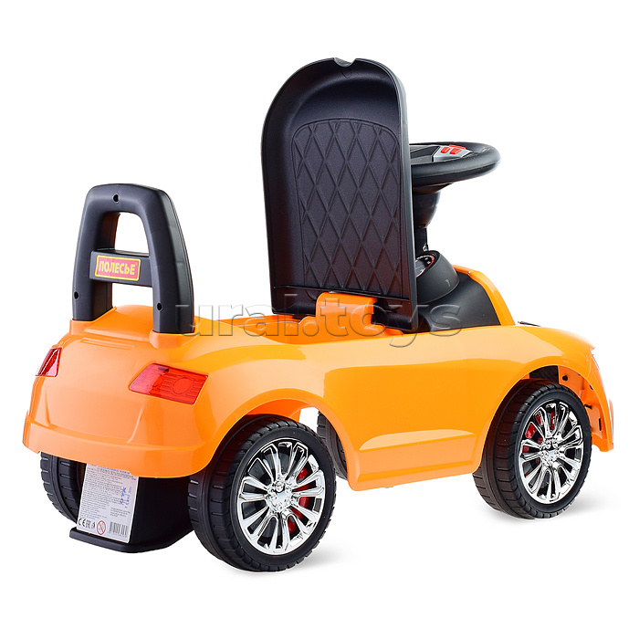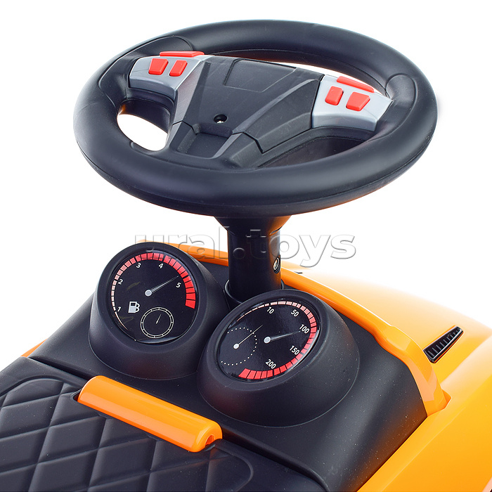 • Габаритные размеры: 665x285x380 мм. • Реалистичный дизайн: имитация металлизированных поверхностей (диски, фары, радиаторная решётка). • Предусмотрен элемент, который позволит избежать опрокидывания. • Игрушка не оборудована системой торможения. • Отделение для хранения мелочей располагается под сиденьем. • Размеры сиденья: 205х260 мм. • Высота сиденья: 23 см. • Каталка оснащена широкими колёсами (толщина 60 мм., диаметр 140 мм.). • Колёса из пластика. • Удобное рулевое управление. • Музыкальный руль с кнопками для управления звуковыми эффектами. • Руль имеет 4 режима: • сирена (3 звука), • клаксон, • звук двигателя, • сброс звуковых эффектов. • Звуковые эффекты работают от 2-х батареек типоразмера АА - не входят в комплект. • Материалы: пластмасса. • Максимальная нагрузка: 50 кг. • Соответствует требованиям безопасности и стандартам качества продукции. • Для детей от 3-х лет.