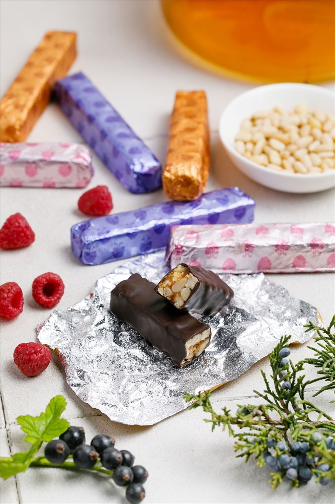 Состав: ядро кедрового ореха, шоколадная глазурь (сахар, какао - масло, какао - порошок, эмульгатор лецитин), ядро кешью, сахар, патока, ягоды сублимационной сушки- облепиха, малина, черная смородина, экстракты ягодные- малины, черной смородины