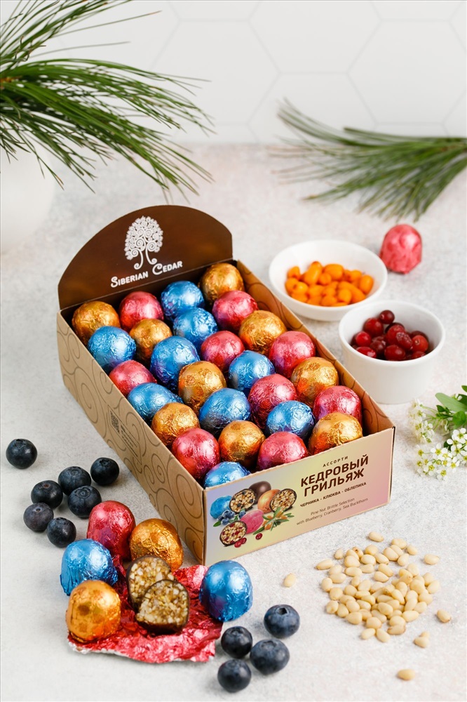 В этом шоу-боксе вы найдете три любимые начинки: дикая клюква, лесная черника и спелая облепиха, каждая из которых придаёт грильяжу свой неповторимый вкус и аромат. Эти конфеты идеально подойдут для подарка друзьям и близким, а также станут полезным десертом для тех, кто ценит натуральные сладости без лишних добавок. Попробуйте "Кедровый грильяж Ассорти" и порадуйте себя и своих близких живительными вкусами Сибири!