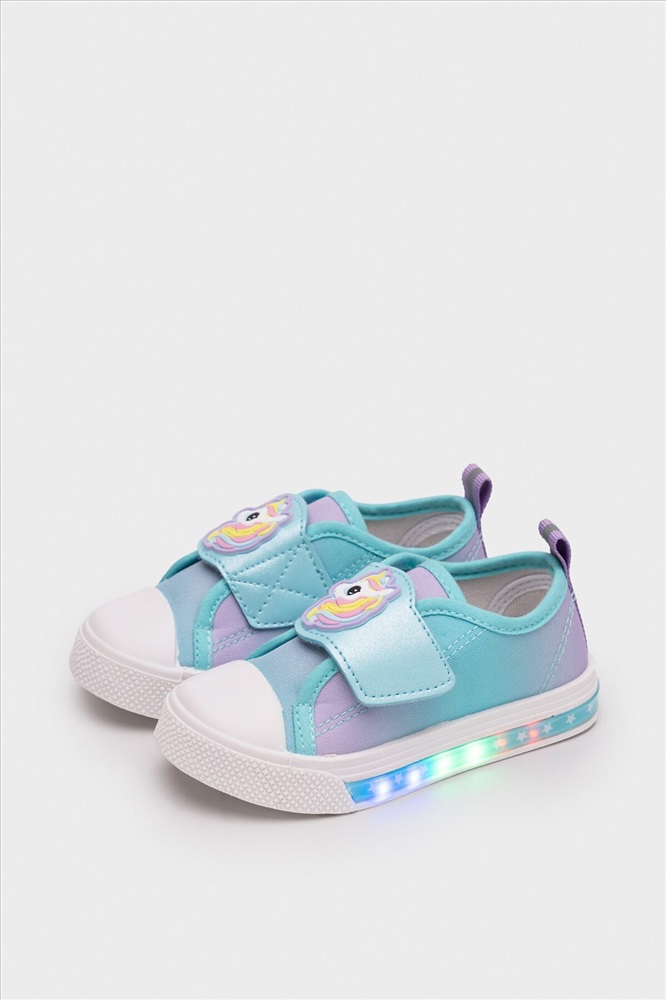 Кеды детские для девочки. Градиентные текстильные кеды на подошве с огоньками. Спереди на липучке имеется патч единорог. Широкая липучка очень удобна и позволяет ребенку обуть кеды самостоятельно. В обуви стоит текстильная хлопковая подкладка c высоким содержанием хлопка 100%, которая обладает высокой гигроскопичностью. Профилированная стелька выполнена из свиной натуральной кожи на основе из амортизирующего материала. Стелька съемная. Имеются светоотражающие элементы. Подошва из ПВХ легкая и гибкая, устойчива к истиранию. Подошва с мигающим элементом flashlight.
