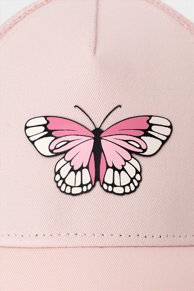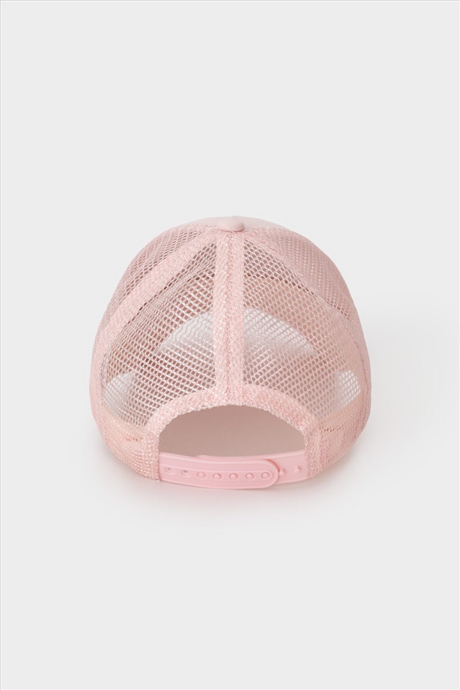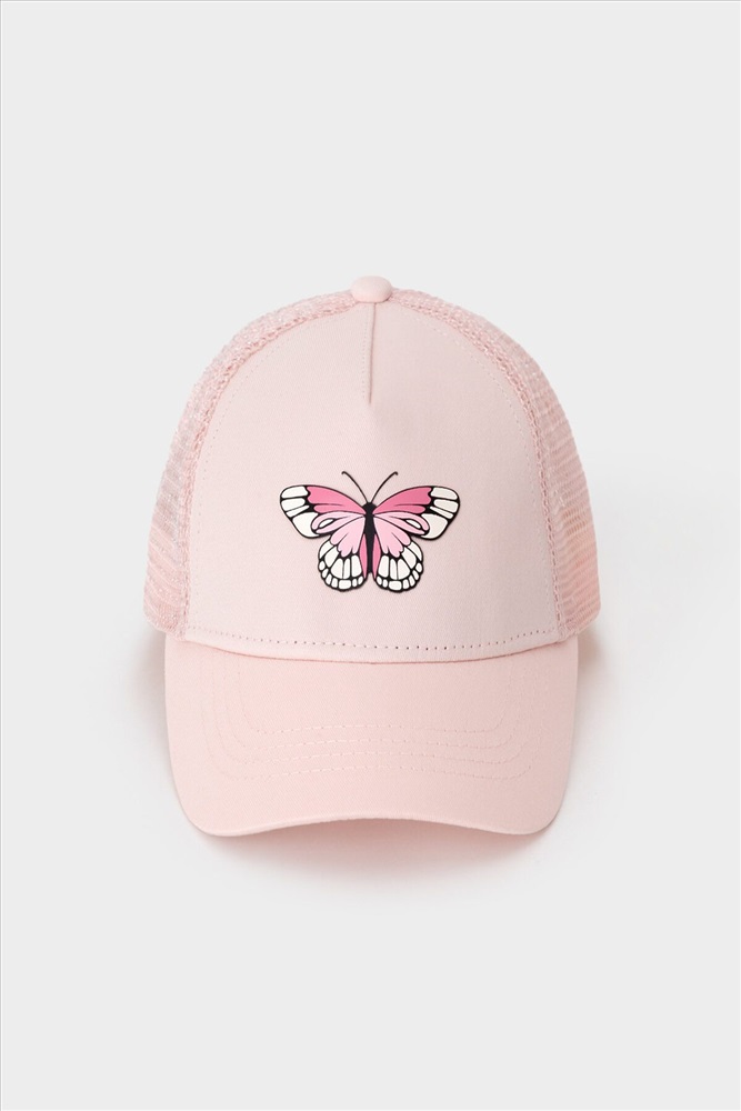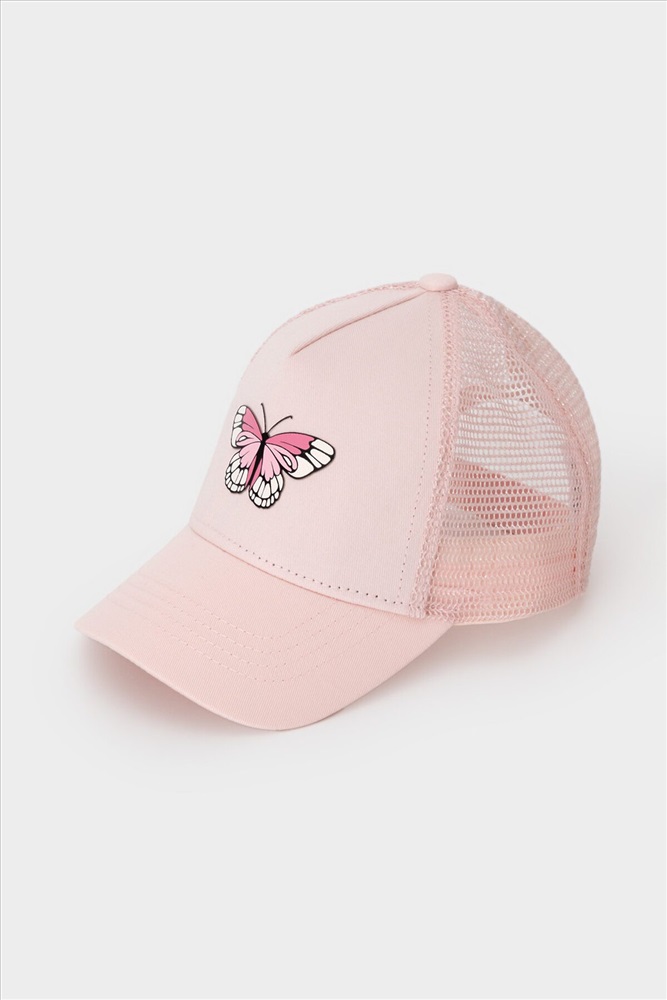 Кепка для девочки из текстиля и сетки. Спереди украшена оригинальной нашивкой. Регулируется по ширине головы и фиксируется на затылке с помощью пластиковой застёжки.
