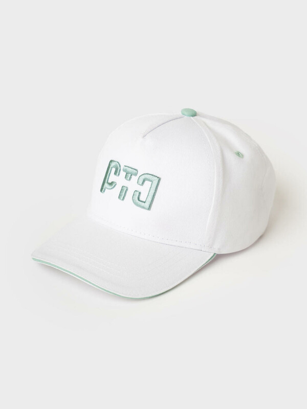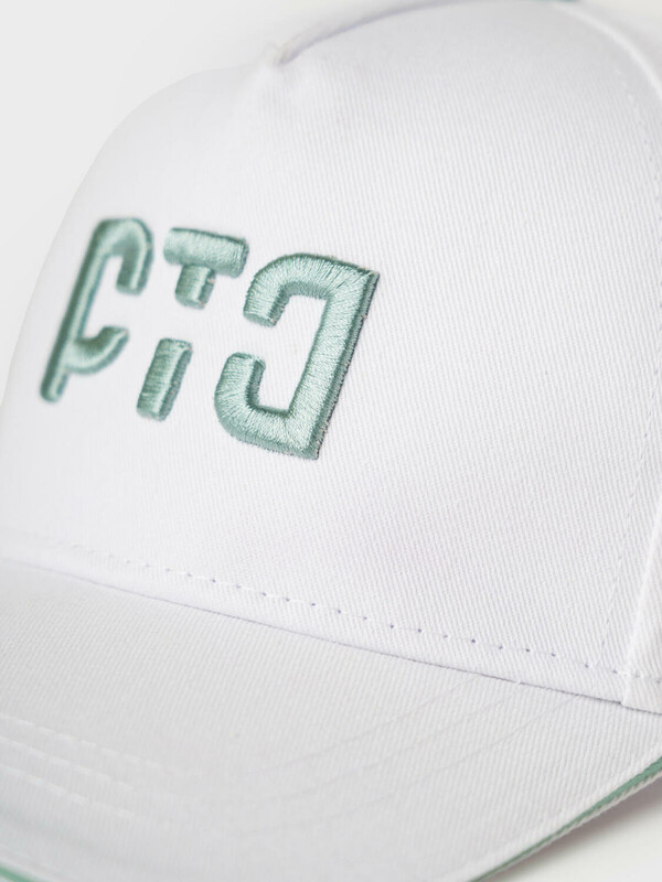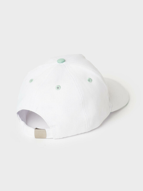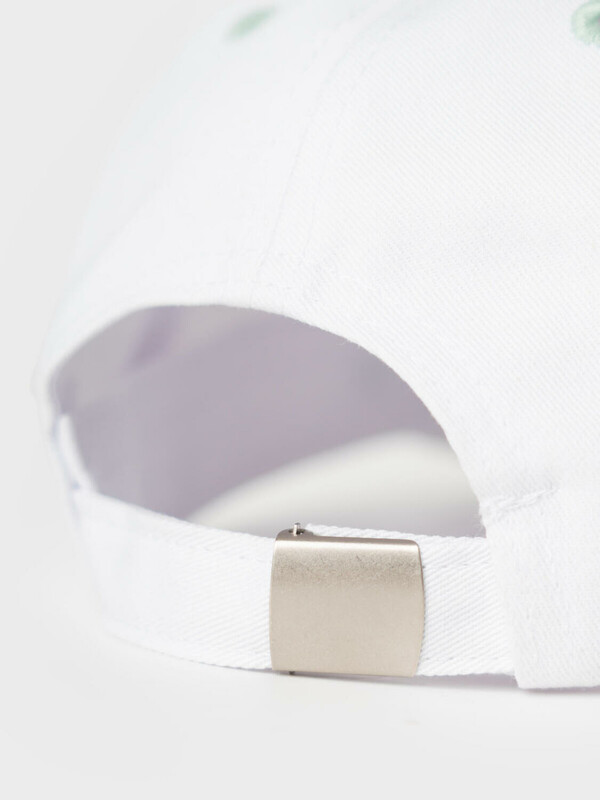 Бейсболка для девочки подростка. Классическая с изогнутым козырьком. На передней панели выполнена объёмная вышивка в мятном цвете. В верхней части – маленькая декоративная кнопка, по бокам – вентиляционные отверстия. Объём можно отрегулировать с помощью металлической застежки-пряжки сзади.