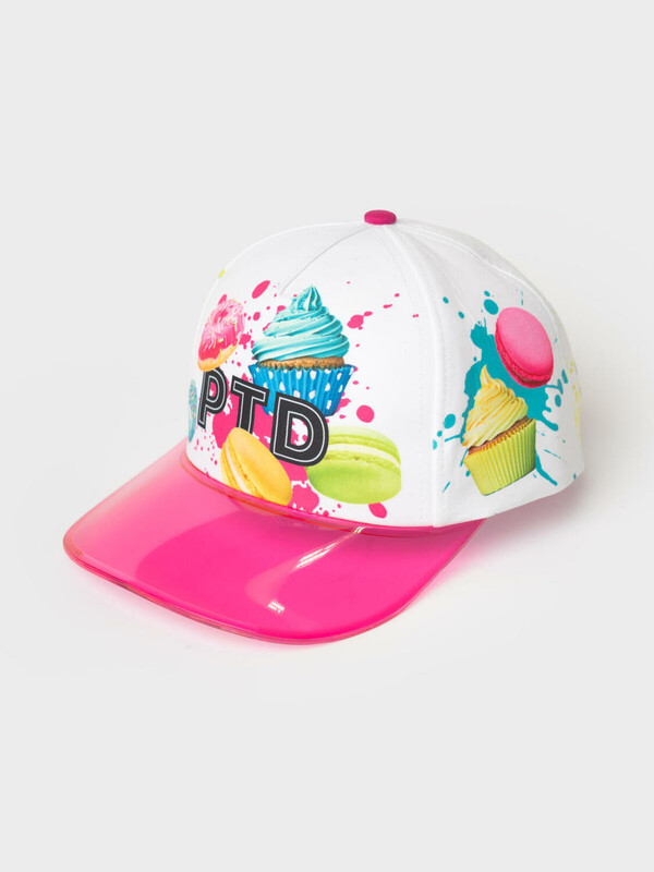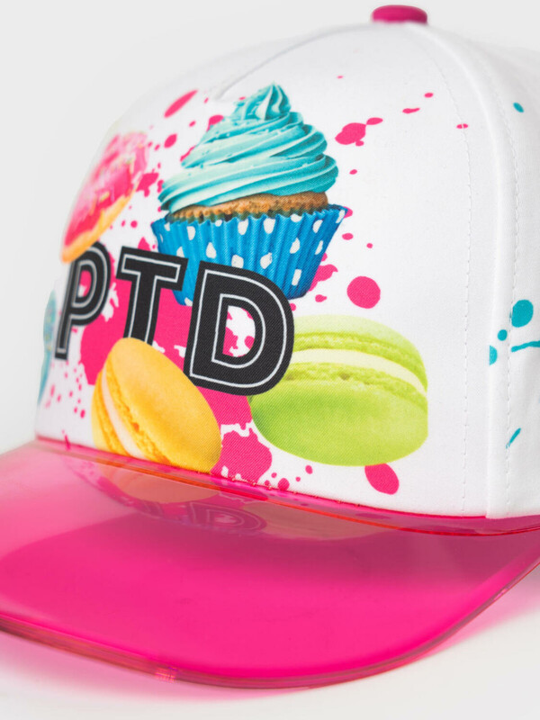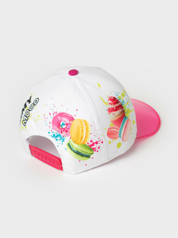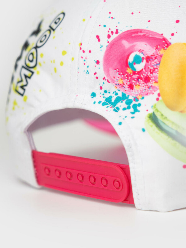 Яркая детская бейсболка для девочки. Выполнена из текстильного материала с цветным принтом. Украшена изображениями сладостей — пончиков, капкейков и макарунов. Спереди — надпись, сзади — слоган. Бейсболка имеет изогнутый козырек розового цвета и регулируемую пластиковую застежку на кнопки.