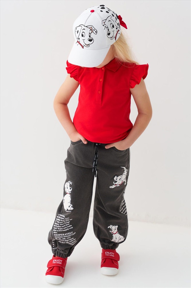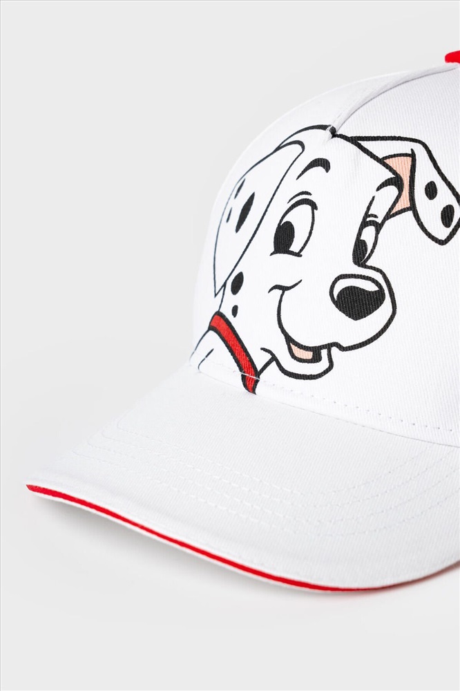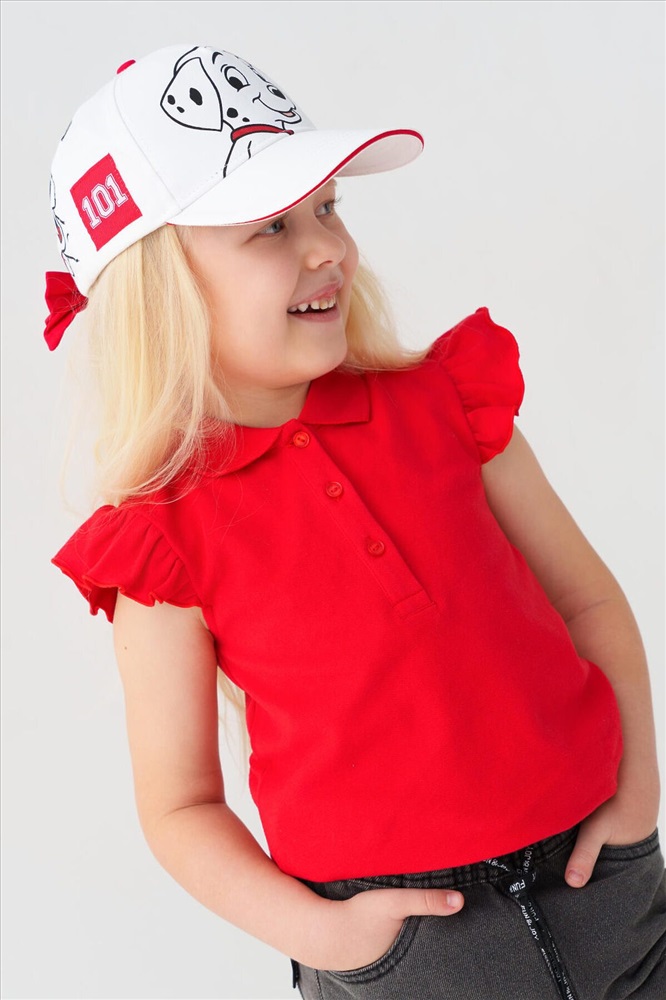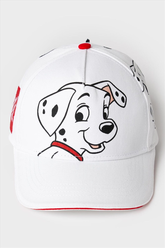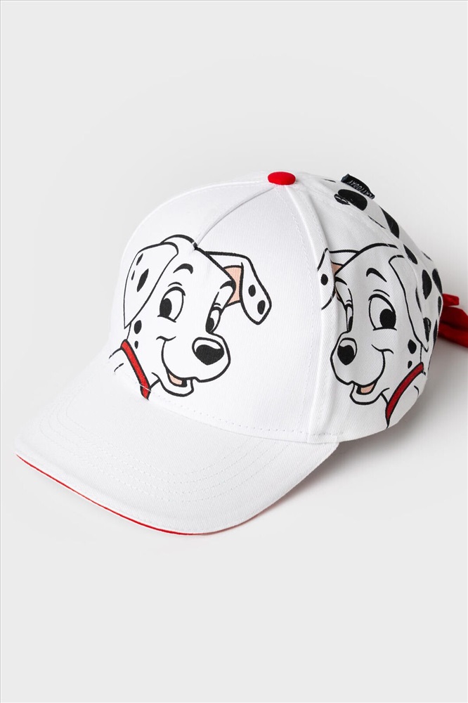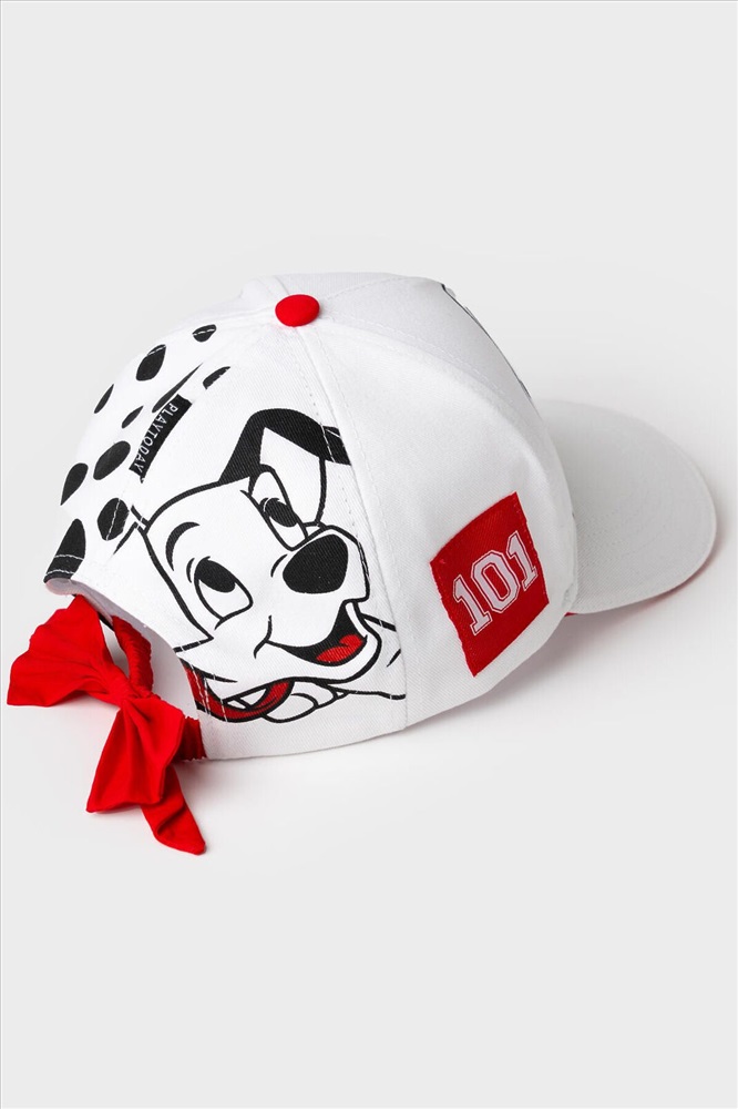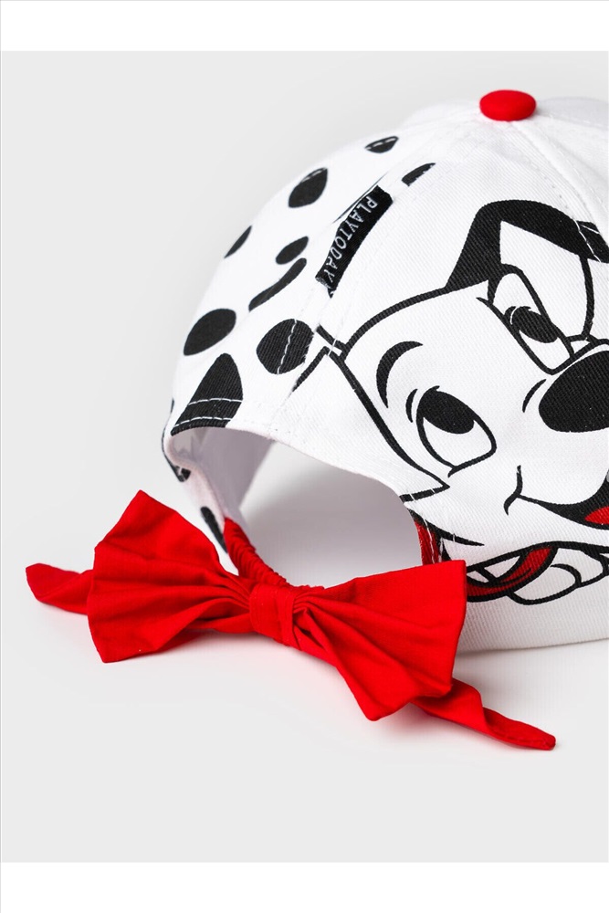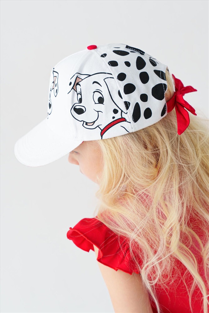 Сезон: Весна/Лето Стильная детская бейсболка для девочки. Выполнена из белой хлопковой ткани с насыщенным принтом с любимыми мультяшными героями - далматинцами. У бейсболки изогнутый козырек, классическая форма. Особое внимание привлекает большой красный бантик-резинка на задней части — он делает изделие особенно нарядным.