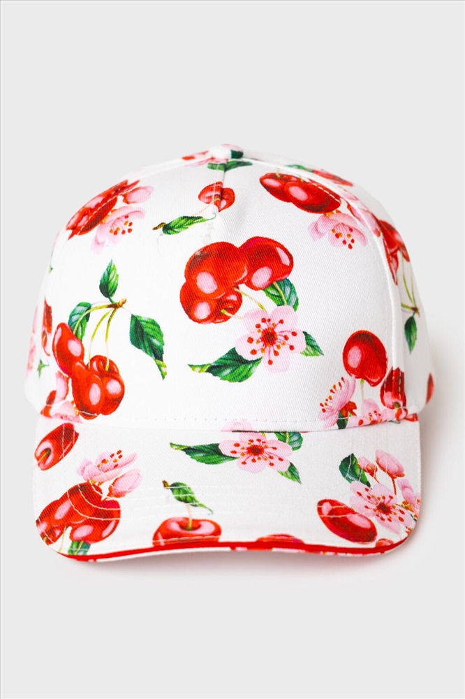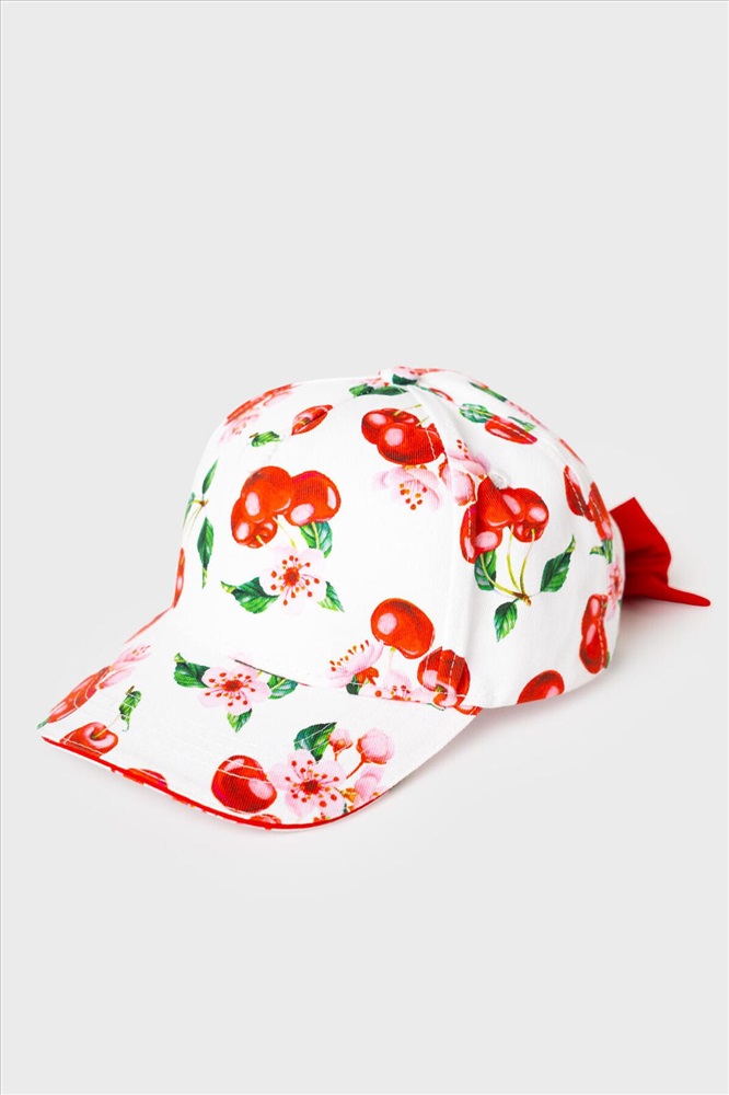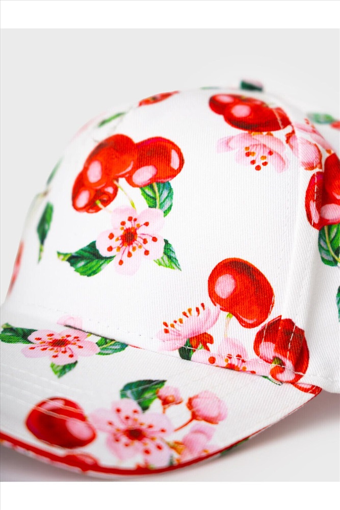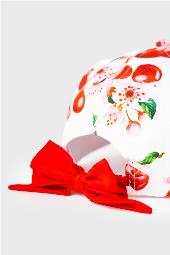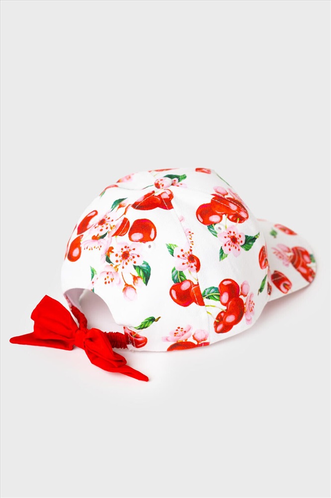 Лёгкая и яркая детская бейсболка для девочки. Выполнена из хлопкового текстиля с красочным принтом: вишни, листья и цветы. Козырёк изогнутый. Сзади — мягкая эластичная резинка, скрытая эффектной красной лентой с бантом. Есть вышитые вентиляционные отверстия.