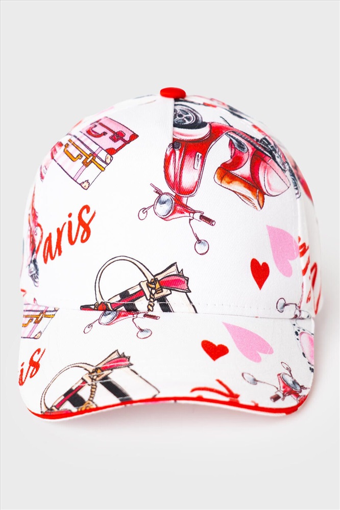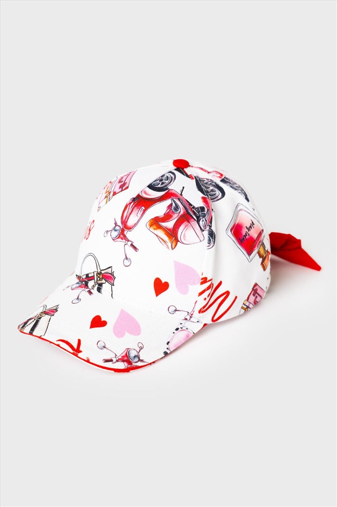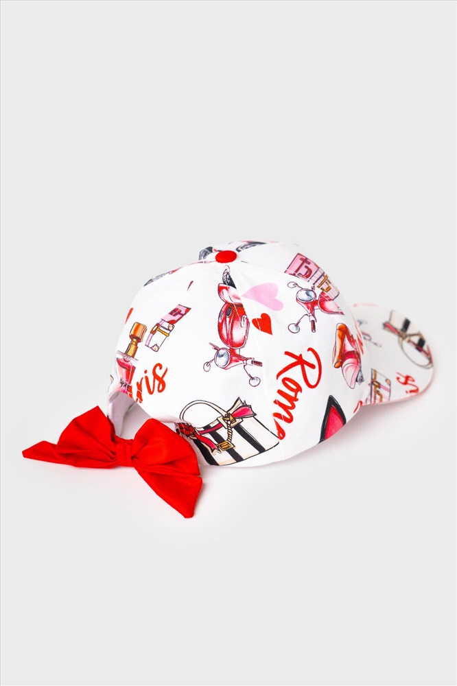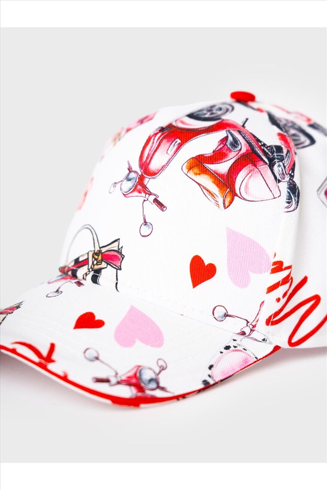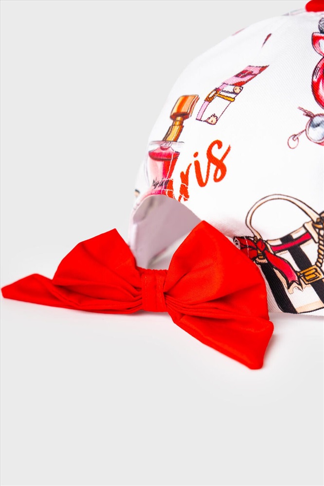 ID товара: 1240435 Состав: 100% хлопок Сезон: Весна/Лето Стильная детская бейсболка для девочки. Выполнена из белой ткани с насыщенным принтом: духи, очки, скутер, сердечки и надписи. У бейсболки изогнутый козырек, классическая форма и вентиляционные отверстия. Особое внимание привлекает большой красный бантик на задней части — он делает изделие особенно нарядным. Комментарии к товару