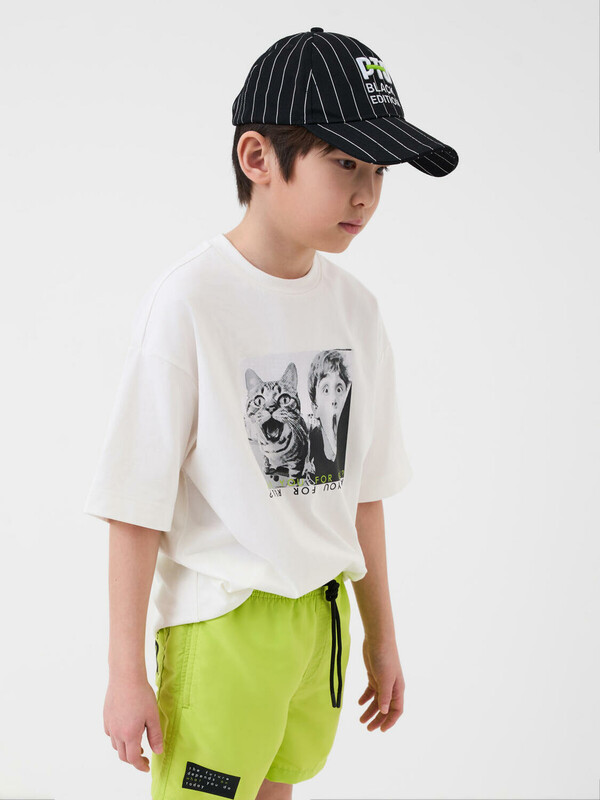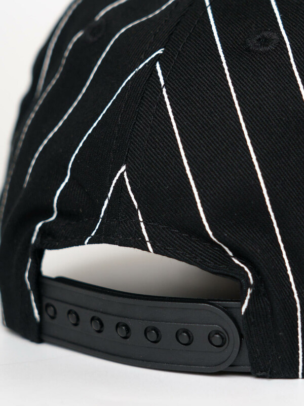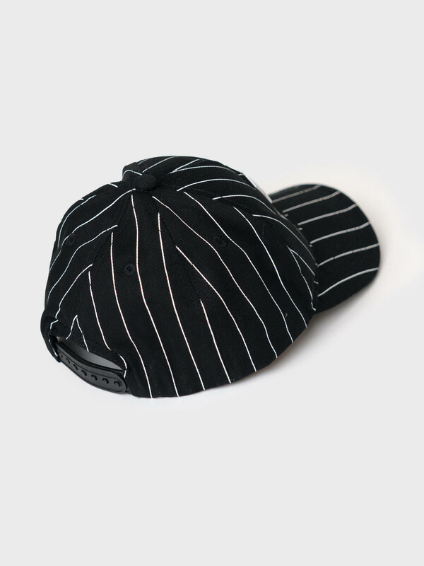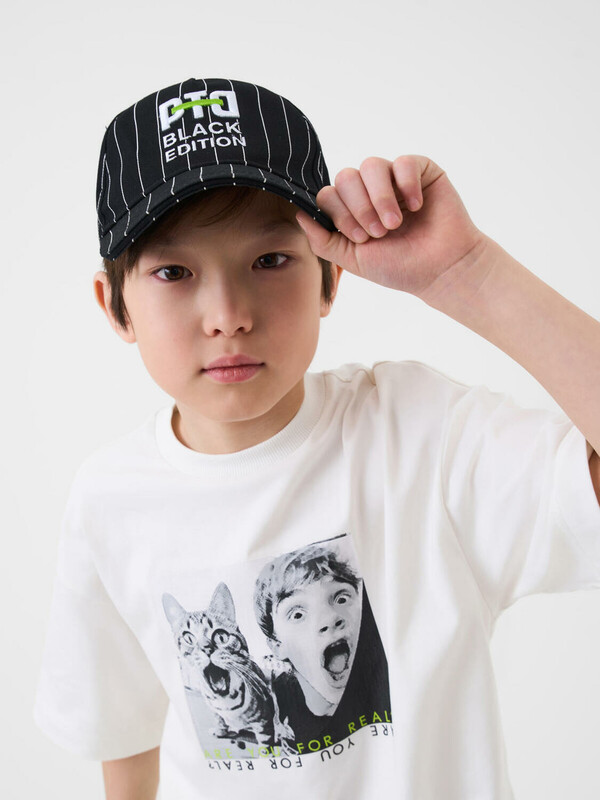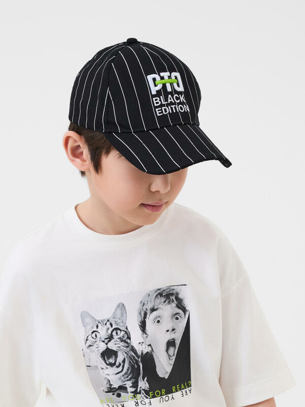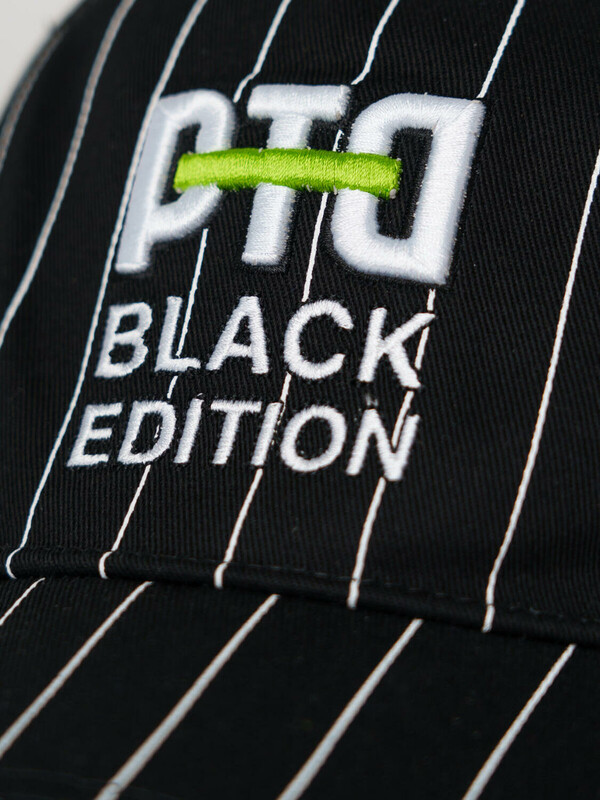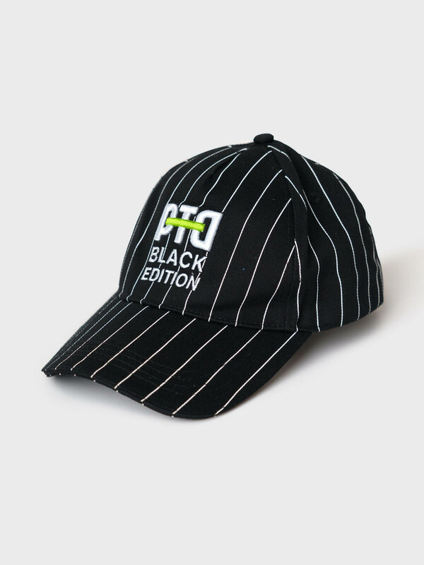 Бейсболка для мальчика подростка. Модель выполнена из чёрного хлопкового текстиля с контрастными белыми полосами. На передней панели — объёмная вышивка с логотипом PTD. Козырёк изогнутый. Сзади — пластиковая застёжка на кнопках с регулировкой размера. Вентиляционные отверстия.