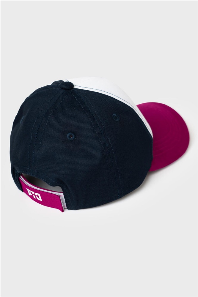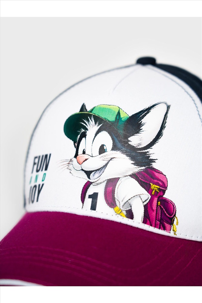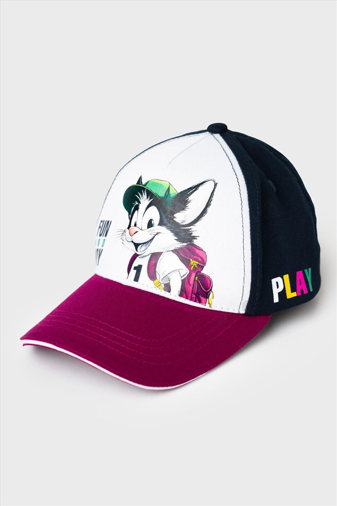 Детская бейсболка для мальчика. Козырёк — изогнутый с белой окантовкой и чёрной декоративной строчкой. Застёжка на липучке позволяет регулировать размер. Бейсболка дополнена вентиляционными отверстиями.