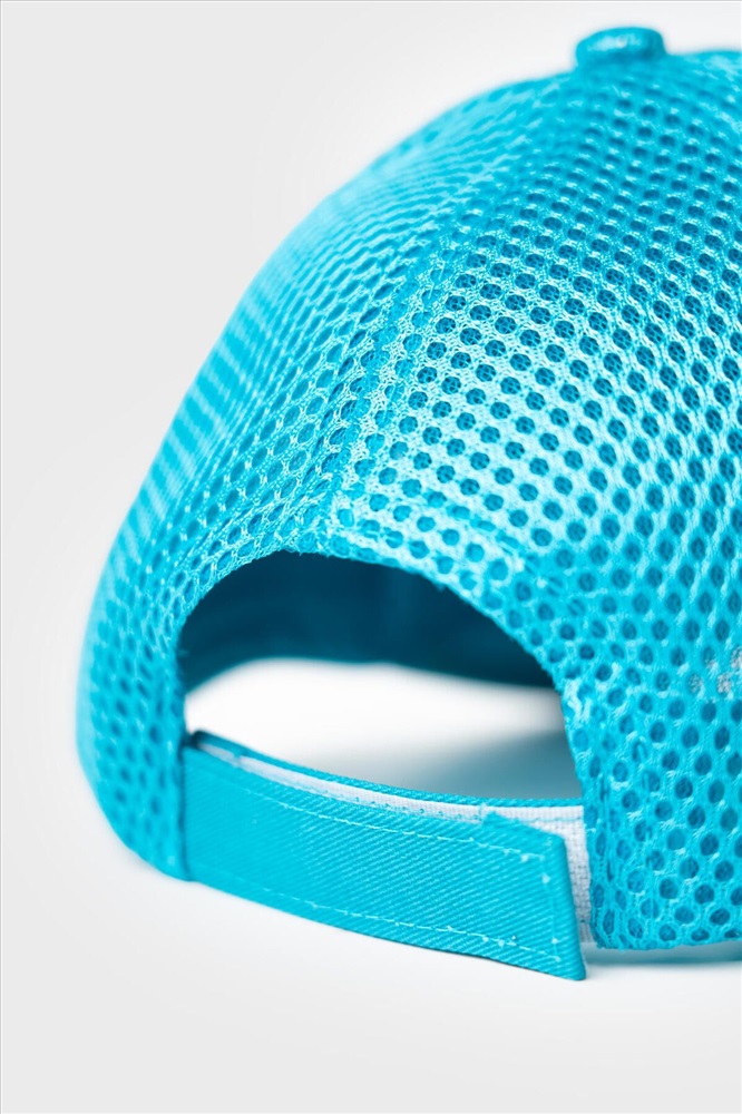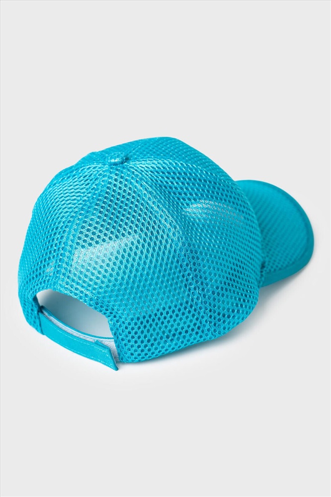 Бейсболка для девочки подростка. Модель из сетчатого материала для хорошей вентиляции в жаркое время года. Кепка с изогнутым козырьком, который отделан черной окантовкой. На передней панели — нашивка. Сзади расположена пластиковая застежка на кнопках, позволяющая регулировать размер.
