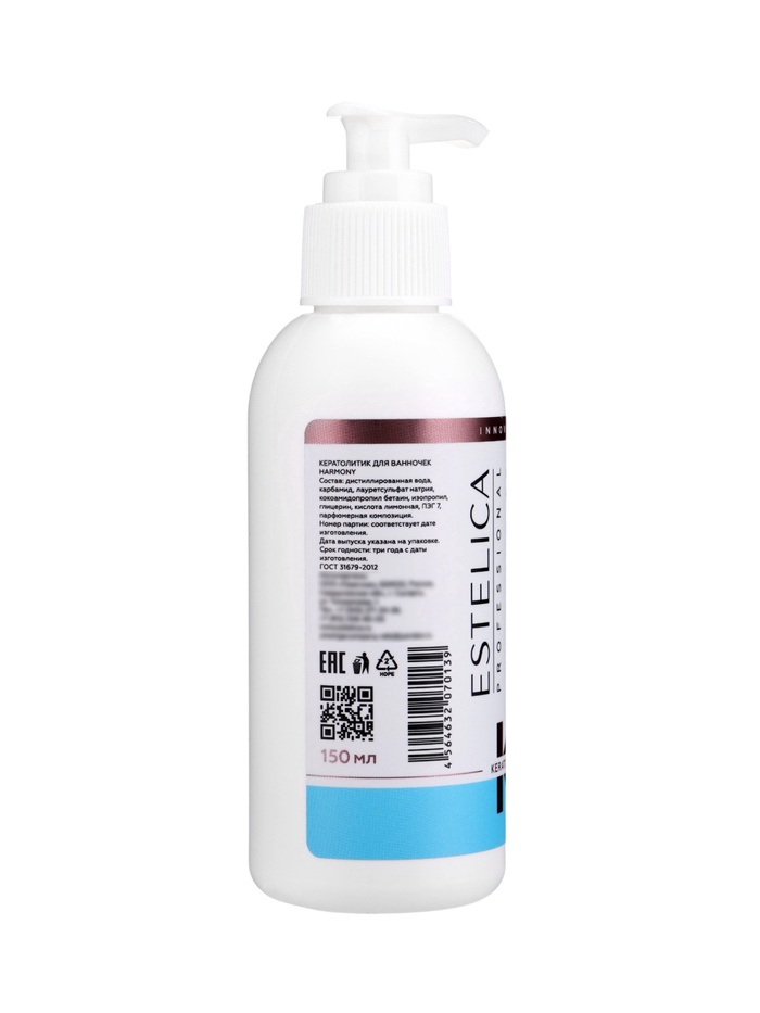 Габариты: 14,5 x 4,7 x 4,7 Страна: Россия В боксе: 16 шт Состав: См. на упаковке Материалы: см. на упаковке Фасовка: по 1 шт Индивидуальная упаковка: Без упаковки Сертификат: ЕАС Объём, мл: 150 Темпер. ограничение НЕ НИЖЕ ℃: 0 Назначение: Пилинг, отшелушивание ESTELICA PROFESSIONAL HARMONY, кератолитик для ванночек 150 мл (дозатор) — профессиональное средство для подготовки к маникюру и педикюру. Эффективно размягчает огрубевшие участки кожи ног, рук и кутикулы, облегчая последующую обработку. Подходит для всех видов маникюра и педикюра, обеспечивая мягкую и деликатную обработку кожи. Способ применения: добавить от 3 до 10 нажатий дозатора в ванночку в зависимости от объема. Залить тёплой водой — средство вспенивается. Подержать руки или ноги в ванночке 5–10 минут, затем приступить к обработке. Для сложных участков нанесите средство на ватный диск и приложите на 2–3 минуты. После процедуры рекомендуется нанести на обработанную поверхность нейтрализатор RECOVERY, дать ему впитаться и промыть руки или ноги. Меры предосторожности: работать в перчатках. Возможна индивидуальная непереносимость компонентов. Использовать только по назначению. Избегать прямого воздействия солнечных лучей. При попадании в глаза промыть водой. Хранить при температуре +5…+25 °C. Состав: карбамид, лауретсульфат натрия, кокоамидопропил бетаин, изопропил, дистиллированная вода, глицерин, лимонная кислота, ПЭГ-7, парфюмерная композиция. Комментарии к товару