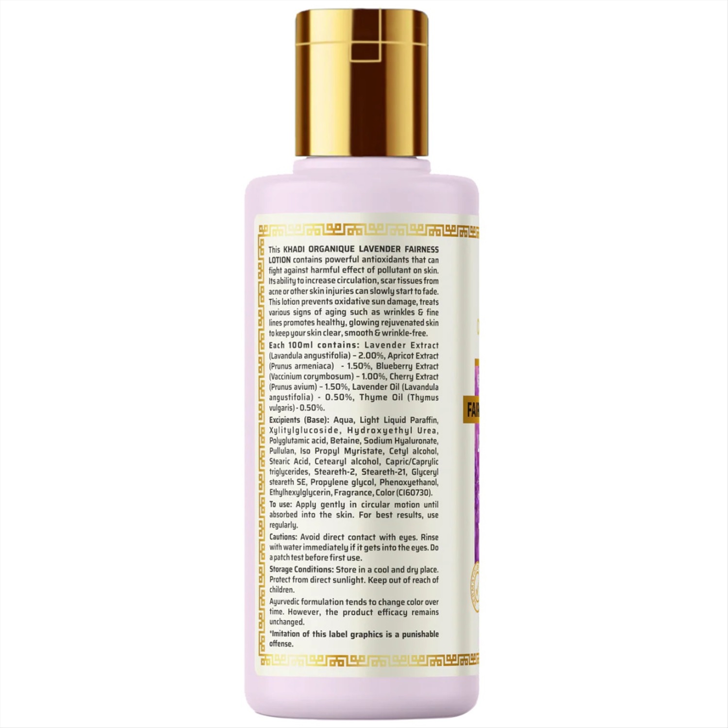 Khadi Natural Lavender Fairness Lotion SLS & Paraben Free — натуральный лосьон для тела с аюрведическими компонентами от индийской компании «Кхади». Тонизирует кожу, обладает антиоксидантными, обезболивающими и противовоспалительными свойствами.