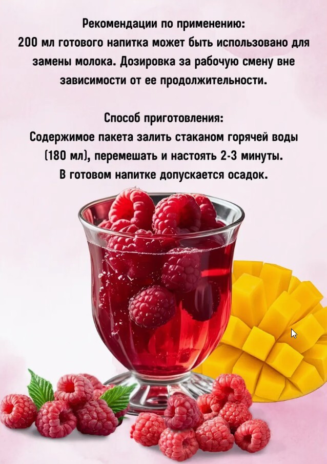 Не упустите возможность насладиться киселем "Манго-малина" от "Сибирская ягода". Этот продукт станет отличным выбором для семейных посиделок или в качестве перекуса на ходу. Его натуральный состав и насыщенный вкус делают его идеальным вариантом для тех, кто заботится о своем здоровье и предпочитает вкусные, но полезные лакомства. Сделайте шаг к улучшению своего рациона уже сегодня!