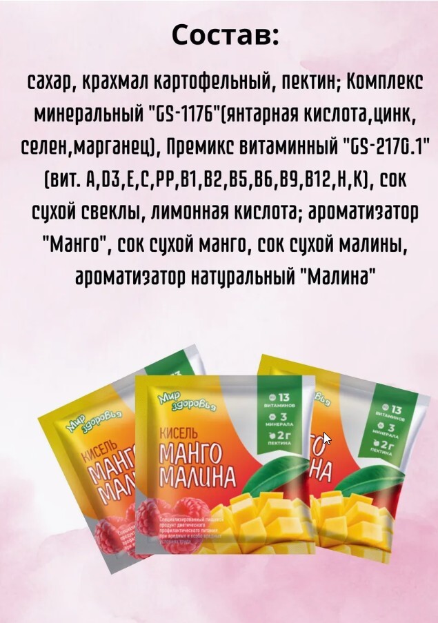 Состав: сахар, крахмал картофельный, пектин, сок сухой свеклы (концентрированный сок свеклы, мальтодекстрин), пищевой ингредиент "Комплекс минеральный "GS-1176" (янтарная кислота, цинк, селен, марганец), пищевой ингредиент "Премикс витаминный "GS-2170.1" (витамины A, D₃, E, C, PP, B₁, B₂, B₅, B₆, B9, B₁₂, H, К), регулятор кислотности- лимонная кислота, ароматизатор "Манго", сок сухой манго (концентрированный сок манго, мальтодекстрин), сок сухой малины (концентрированный сок малины, мальтодекстрин), ароматизатор натуральный "Малина".Содержание пектина 10 г на 100г сухого продукта. Не содержит ГМО.