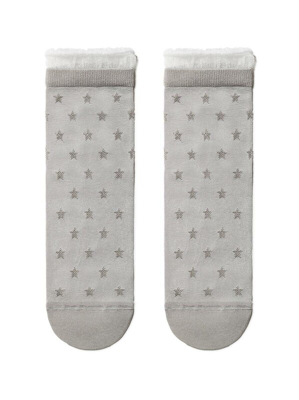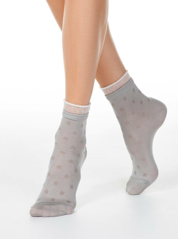 Носки из вискозы с глянцевым рисунком и декоративной прозрачной сеткой по краю резинки созданы для девушек, которые любят носить оригинальные носочки и с удовольствием подчеркивают свою индивидуальность. Носки смотрятся так стильно, что их хочется надевать снова и снова.
