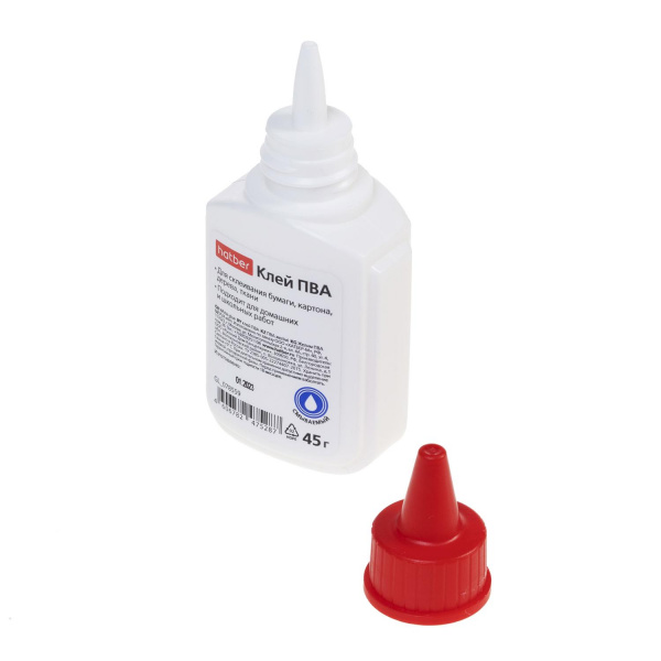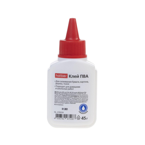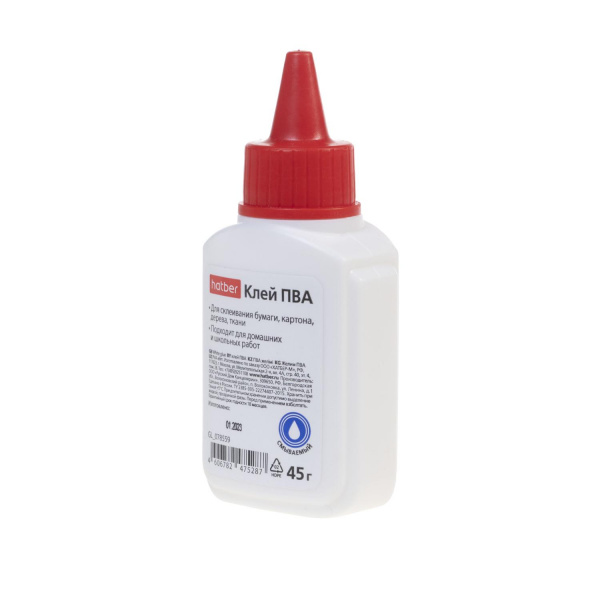 Клей ПВА отлично склеивает картон и бумагу, дерево, ткань и кожу. Подходит для использования в офисе, дома и в школе на уроках труда. Клей безопасен при использовании: не содержит растворителей, не оставляет следов и легко смывается водой. Подходит для детей старше 3-х лет. Он экономично расходуется благодаря дозатору, который обеспечивает точное нанесения клея на склеиваемые поверхности. Также клей устойчив к резким перепадам температур, выдерживает многократные замораживания и размораживания, сохраняя при этом потребительские свойства и однородность текстуры. Хранить при температуре выше +5 С.Объем: 45гр . Упакован в термоусадочную пленку по 10 шт.