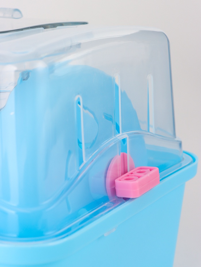 - Безопасный пластик: Материал не впитывает запахи, легко моется и не содержит вредных примесей. Гладкие стенки предотвращают травмы лап и зубов — особенно важно для активных пород вроде сирийских или джунгарских хомяков.