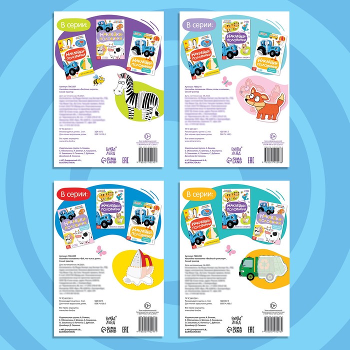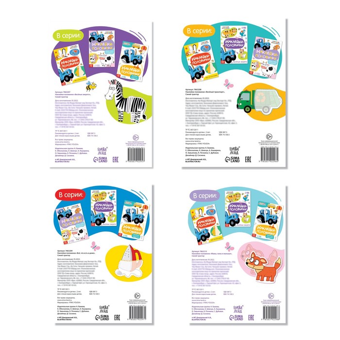 Габариты: 15 x 0,5 x 21 Страна: Китай В боксе: 170 набор Состав: Бумага, бумага самоклеящаяся Материалы: бумага, бумага самоклеящаяся Фасовка: по 1 набор Индивидуальная упаковка: Пакет Габариты товара: 21 см × 15 см × 0,8 см Сертификат: ЕАС Набор: Да Для кого: Унисекс Формат: А5 Возраст: От 2 лет Количество страниц: 48 Год издания: 2022 Тематика: Мультфильмы, Детская Тематика праздника: Универсальная тематика Вид наклейки: Наклейка-игра Тип обложки: Мягкий переплёт Автор: Дубовая София Федоровна Набор книг с наклейками «Весёлые половинки» — это увлекательный способ познакомить ребёнка с окружающим миром через игру. Четыре тематические книги с любимыми героями из мультфильма «Синий трактор» помогают развивать логику, внимание и мелкую моторику. Что делает этот набор особенным