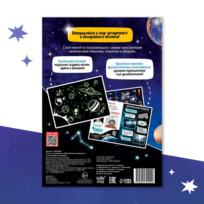 Габариты: 24 x 17 x 0,1 Страна: Китай В боксе: 180 шт Состав: Бумага, бумага самоклеящаяся Материалы: бумага, бумага самоклеящаяся Фасовка: по 1 шт Индивидуальная упаковка: Пакет Габариты товара: 17 см × 0,2 см × 24 см Сертификат: ЕАС Набор: Нет Для кого: Для мальчика Формат: А5+ Возраст: От 7 лет Год издания: 2024 Тематика: Космос Тематика праздника: Универсальная тематика Возраст: Детский Вид наклейки: Без особенностей Тип обложки: Мягкий переплёт Автор: Сазанова Яна Николаевна Книга с наклейками «100 фактов о космосе» станет настоящим подарком для юного исследователя галактики. Она поможет ребёнку увлечённо изучать просторы Вселенной и знакомиться с интересными фактами о планетах, звёздах и космических технологиях. Уникальное дополнение — светящийся плакат, который станет украшением детской комнаты и напоминанием о захватывающем мире космоса. Преимущества