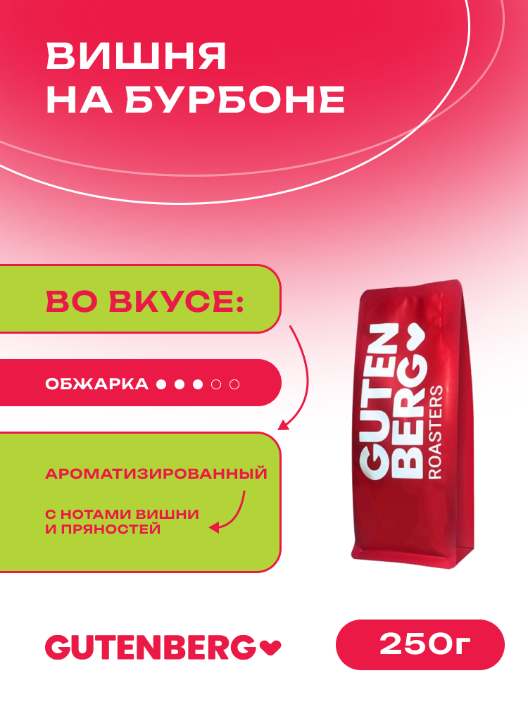 Насыщенный вкус свежеобжаренной 100% арабики с ярким ароматом вишнёвого леденца и сочной спелой вишни во вкусе, с оттенками ликёра, дополненный нежным послевкусием.
