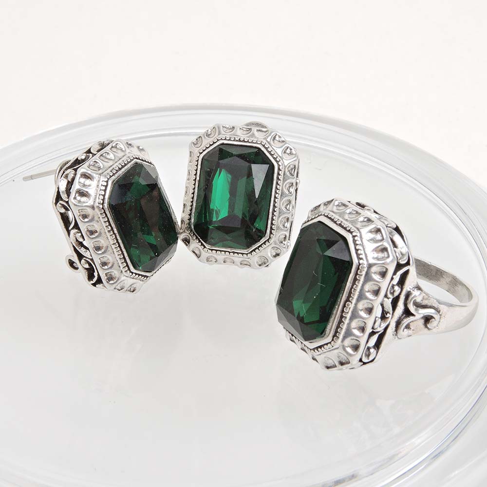 Цвет: Зелёный Металл: Серебрянный Материал: Ювелирный сплав Вставка: Стразы Производство: Китай Количество: шт Кольцо/Серьги зелёное с гальваническим покрытием под серебро со стразами