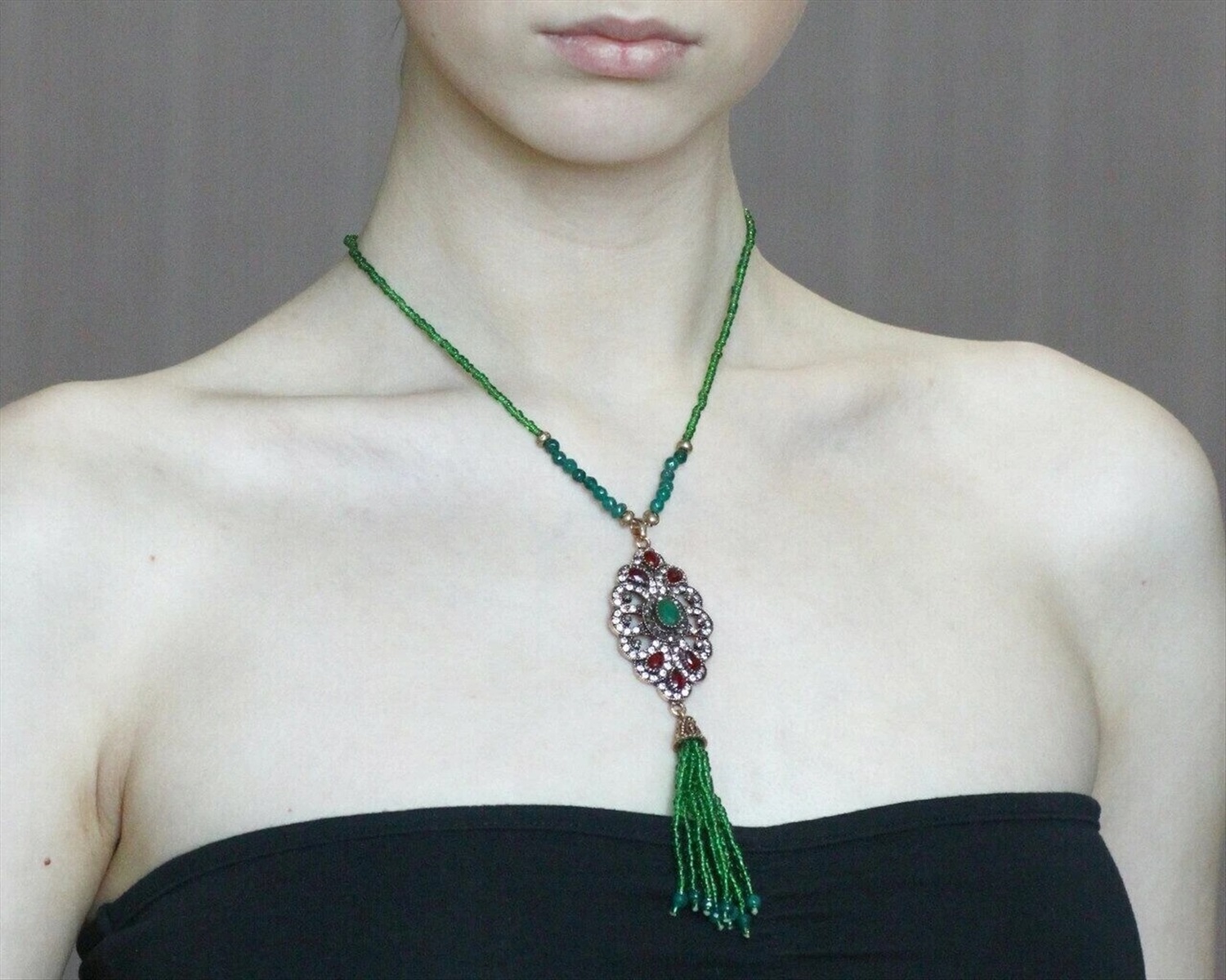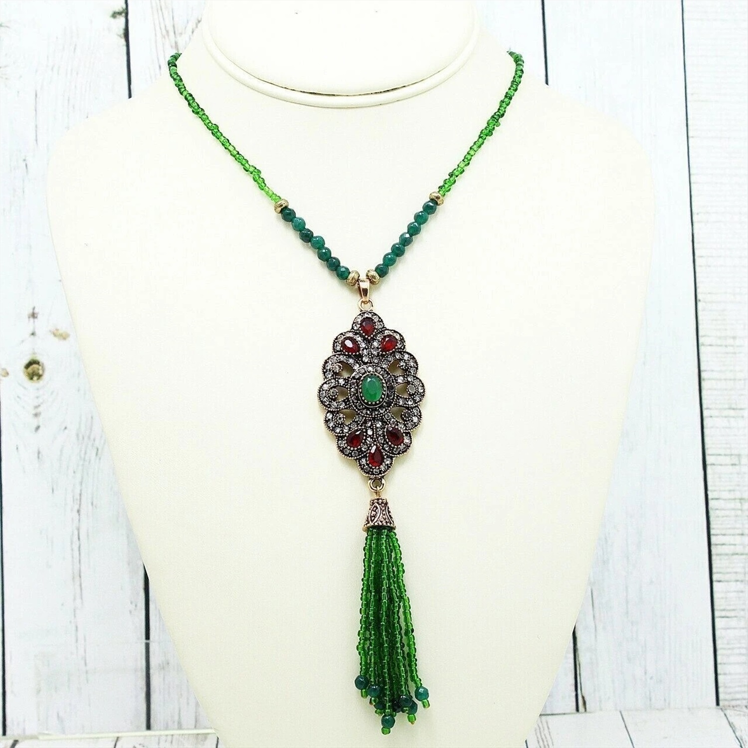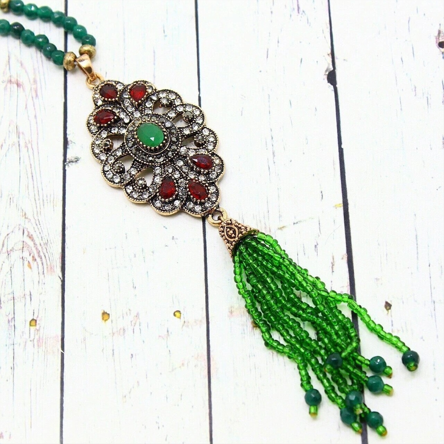 Красивое колье восточного стиля из специального гипоаллергенного ювелирного сплава, который покрыт золотом или устойчивым родиевым покрытием, предотвращающим раздражение кожных покровов.