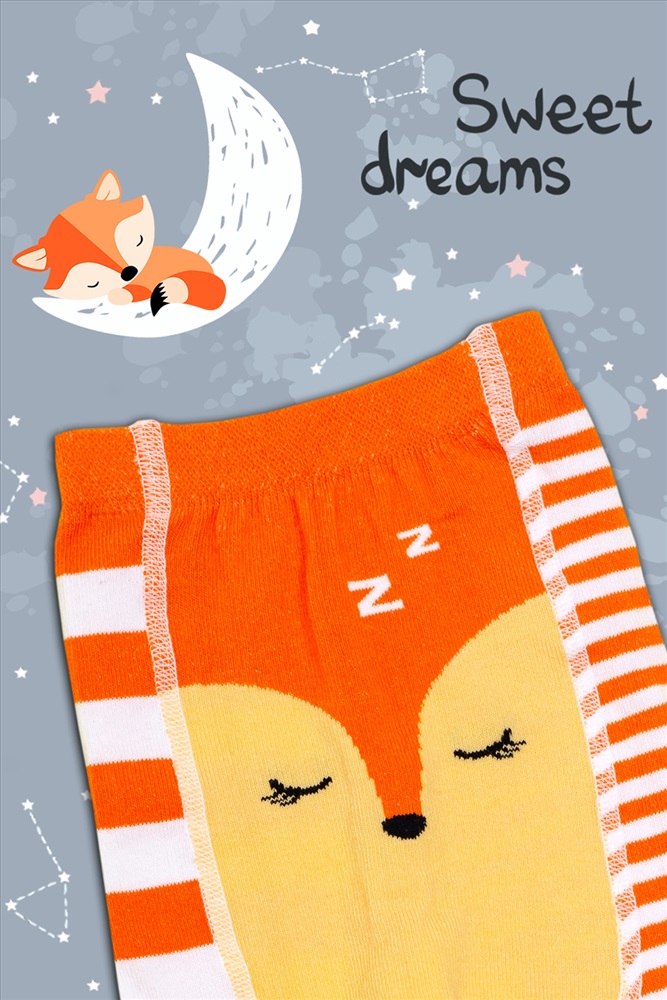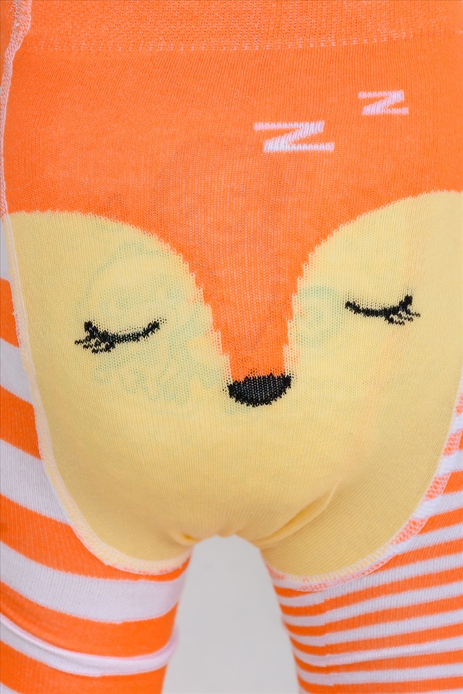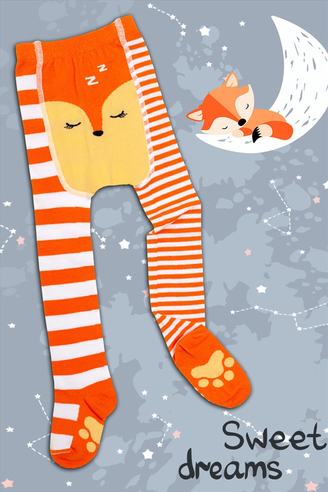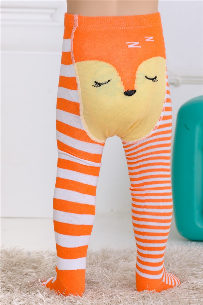 Яркие колготки для малышей. Оригинальная расцветка в полоску - по одной ножке широкая полоса, по другой - узкая. На стопе вывязаны милые лапки, сзади - мордочка спящего лисенка