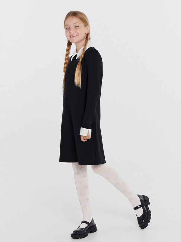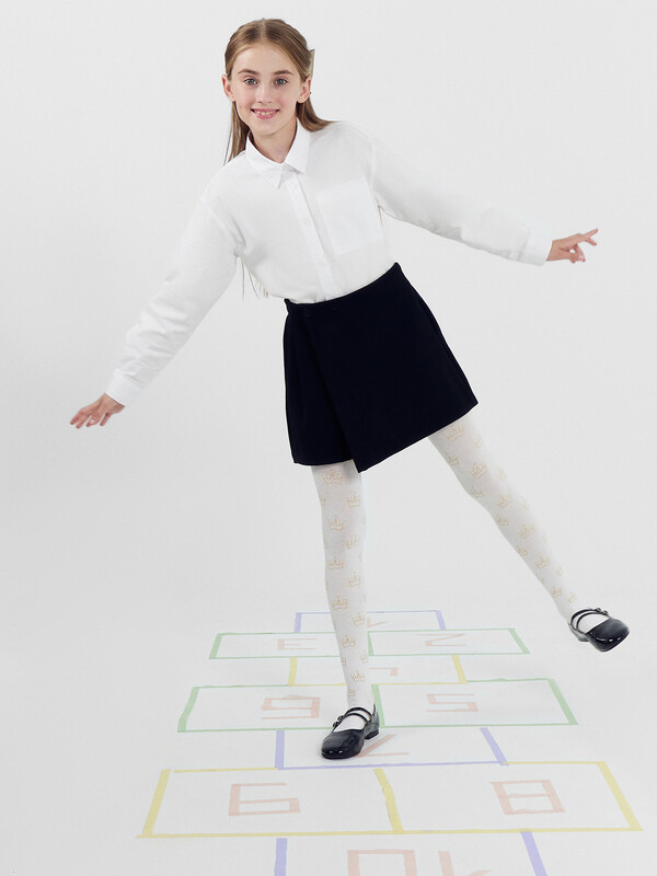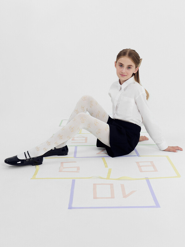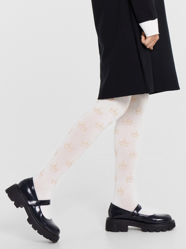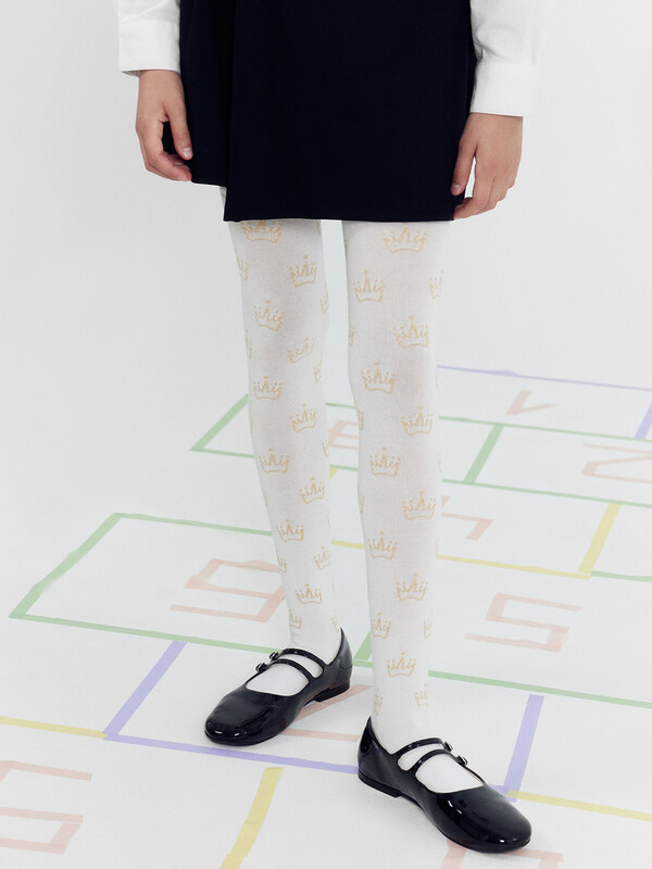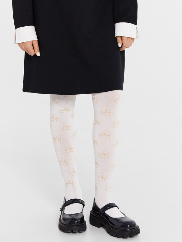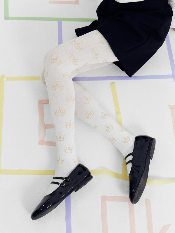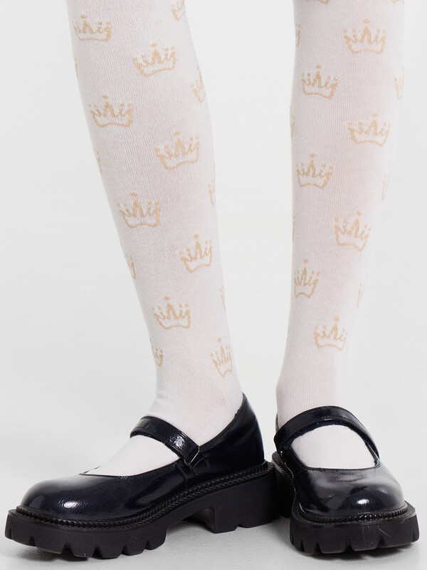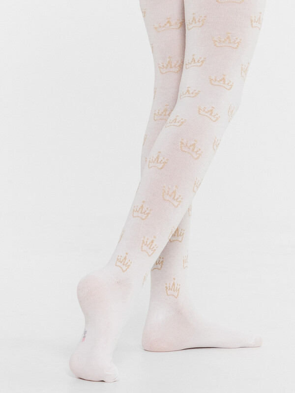 Колготки гладкие с рисунком в виде люрексных корон. Состав: 2% Мет / 2% эластан / 21% ПА / 75% хлопок
