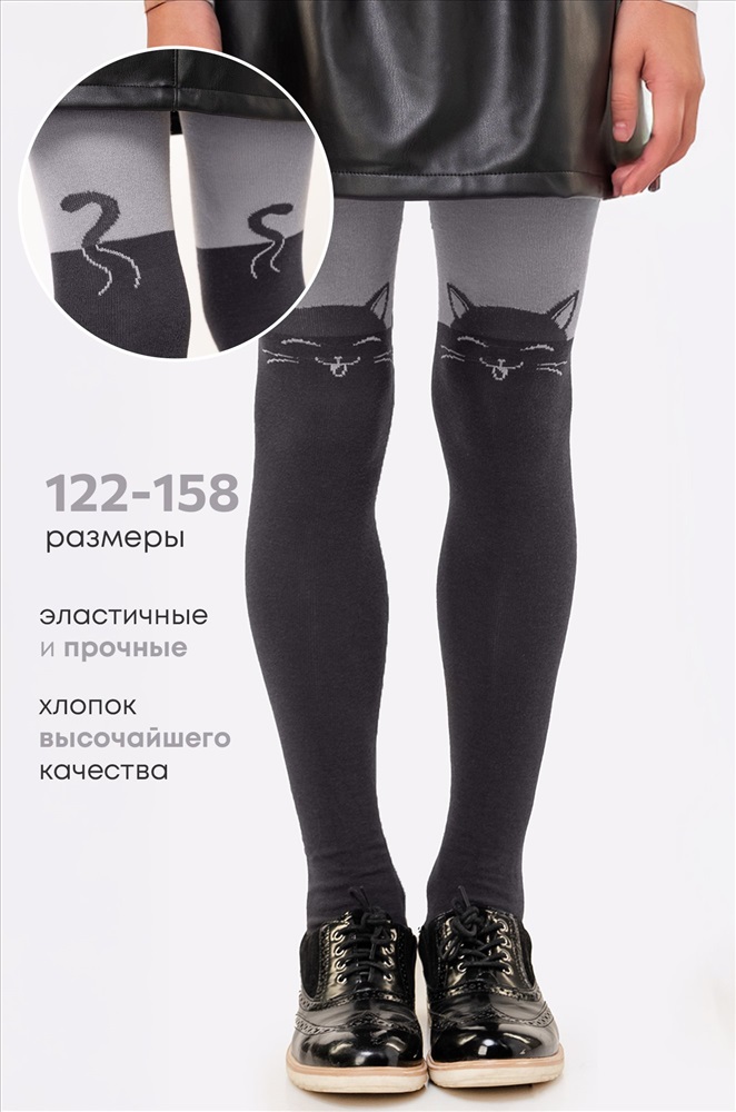 Стильные трикотажные колготки для девочек и девочек подростков украшены забавным рисунком кошечки, которые непременно вызовут улыбку и сделают любой образ ещё интереснее.
