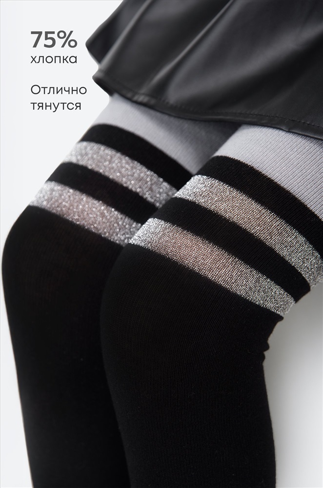 Фантазийные колготки для девочки и девочки-подростка украшены блестящими полосами из люрекса, придающими образу утонченность. Демисезонная модель серо-черного цвета выполнена с высоким содержанием хлопка и добавлением синтетических волокон, что придает высокую прочность, эластичность и комфорт.