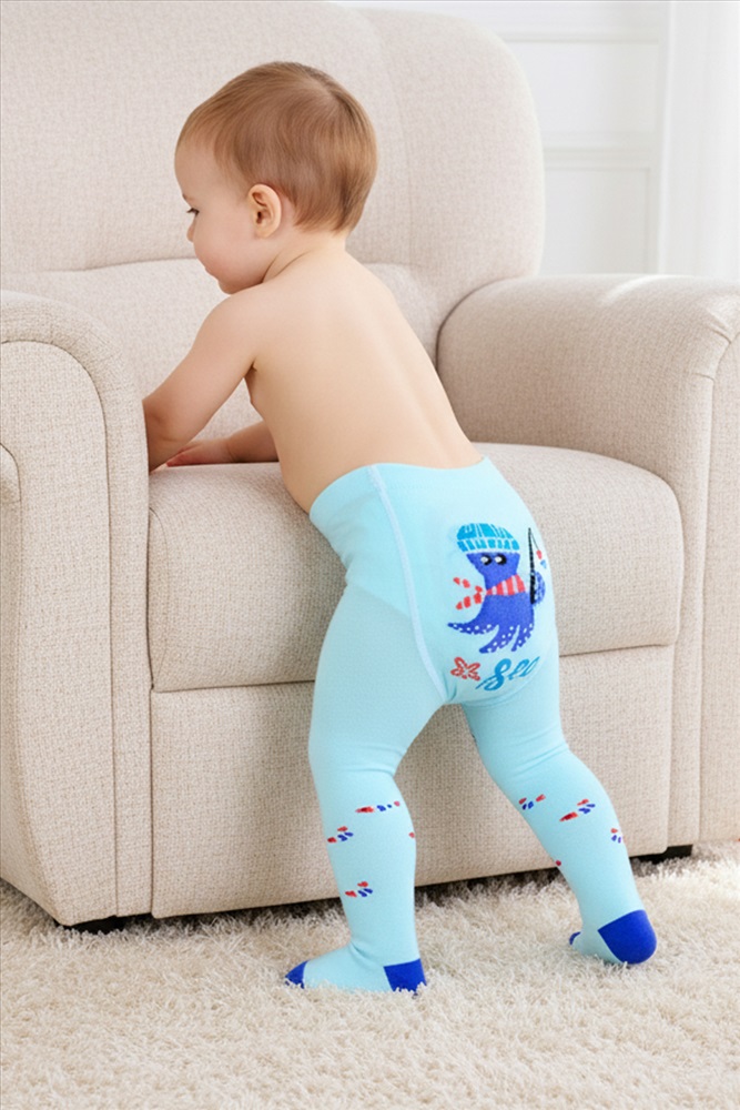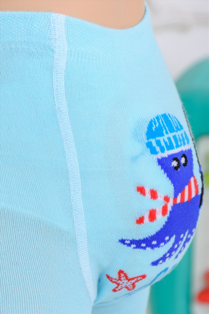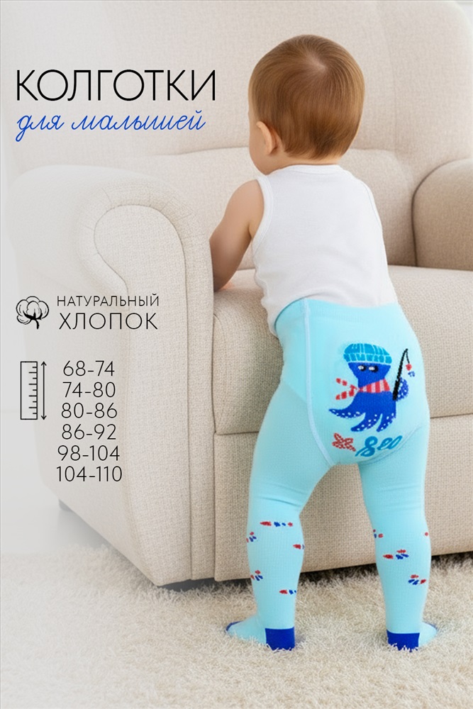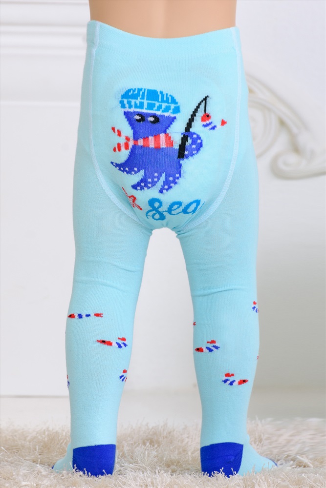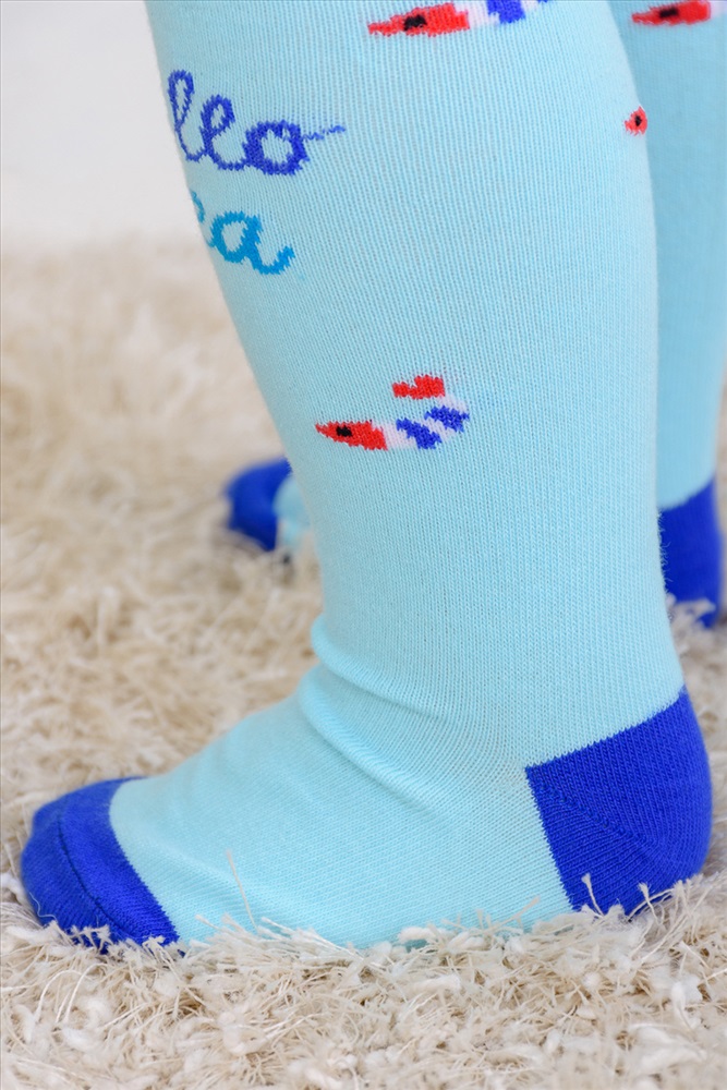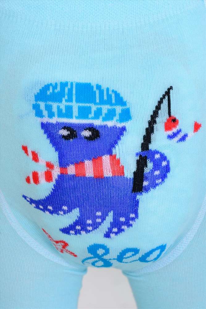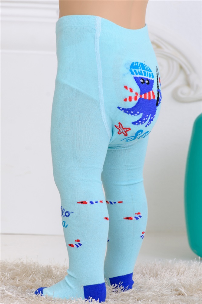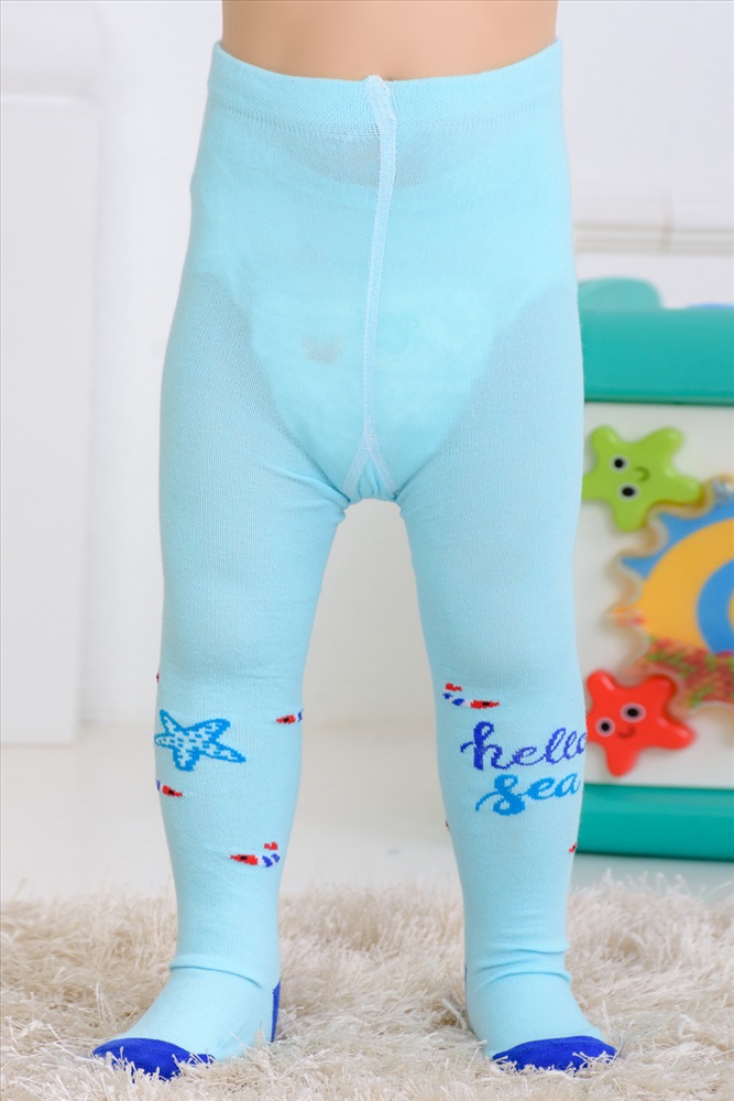 Детские колготки с рисунками. Спереди вывязаны морские звезды и надпись Hello sea (Привет, море), сзади вывязан веселый осьминог