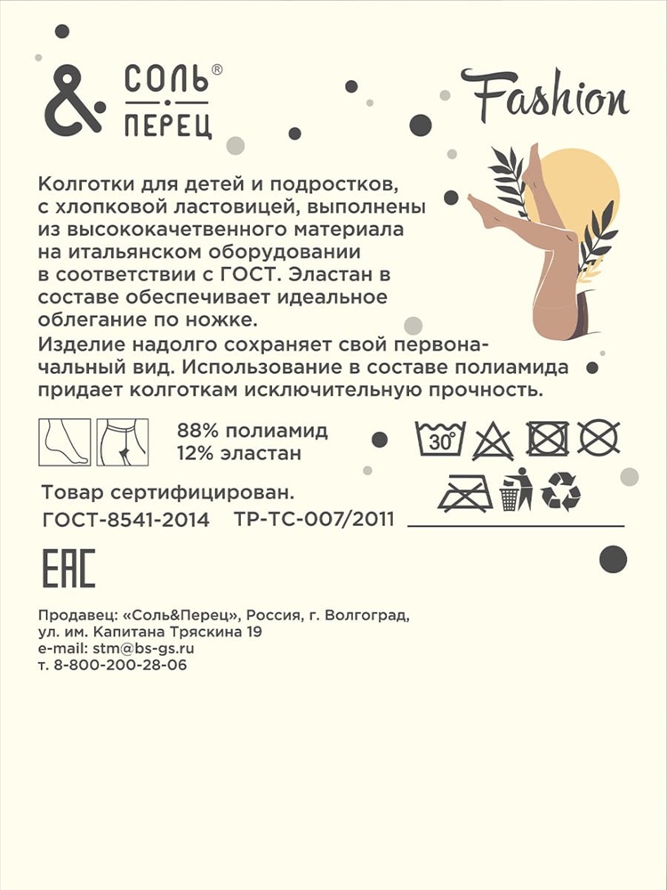 Производитель: Соль&Перец; Цвет: загар; Бренд: Соль&Перец; Пол: Девочки; Производитель: Россия; Сезон: круглогодичный; Категория: Колготки; Комплектация: 1 колготки; Уход за вещью: Максимальная температура стирки 30С.; Страна бренда: Россия; Состав материала: 88% полиамид, 12% эластан