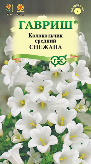 Привлекательное растение из семейства Колокольчиковых высотой 80 см. Цветки бокальчато-колокольчаты, белоснежне, до 7 см длиной и 5-7 см в диаметре, собраны в крупные эффектные соцветия. Цветет с июня по сентябрь. При своевременном удалении отцветающих соцветий цветение - обильное. Предпочитает солнечные участки с хорошо обработанными плодородными почвами. Выращивают прямым посевом в грунт в начале мая или во второй половине октября. Зацветают растения на второй год. Используется для оформления участка и для срезки. Хорошо сочетается с хостами, астильбами. В срезке стоит до 12 дней.