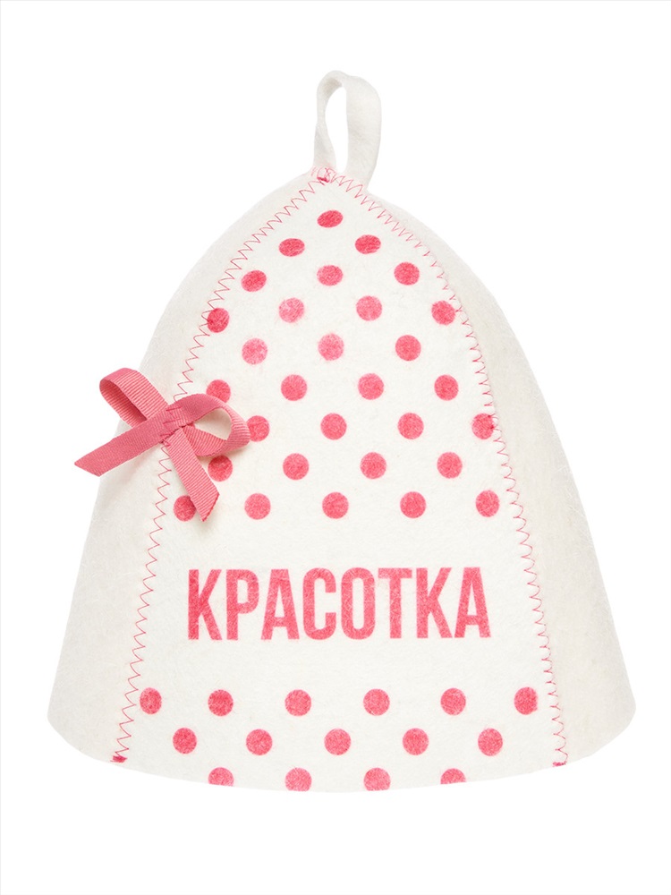 Шапка для бани "Красотка" классической формы сделана из белого войлока и украшена ярким принтом, а также декоративным бантиком.