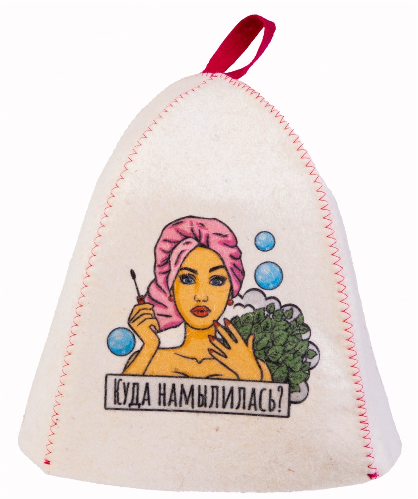 Шапка для бани "Куда намылилась" сделана из белого войлока и украшена оригинальным ярким принтом.Шапка является основным банным аксессуаром. Этот предмет защитит вашу голову от перегрева и сделает банные процедуры приятными.Наши шапки из войлока обладают рядом положительных свойств: они антибактериальны, не электризуются и не впитывают запахи!Наши банные принадлежности отлично пропускают воздух и тепло, из-за чего всегда поддерживают комфортную температуру и влажность.Шапка универсальна по размеру и оснащена удобным подвесом-петлей, что позволяет с легкостью просушить её после парения.
