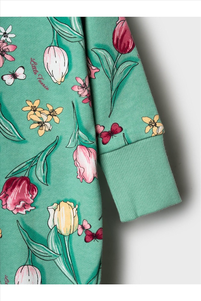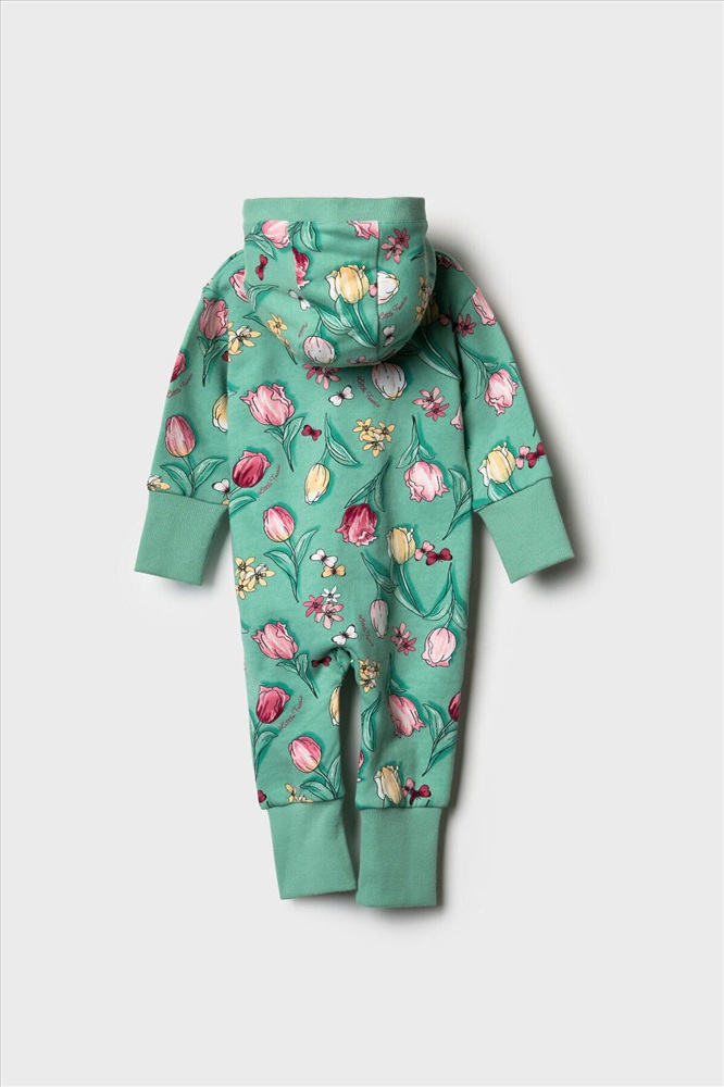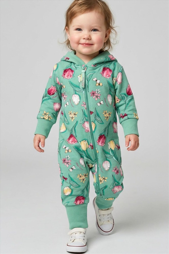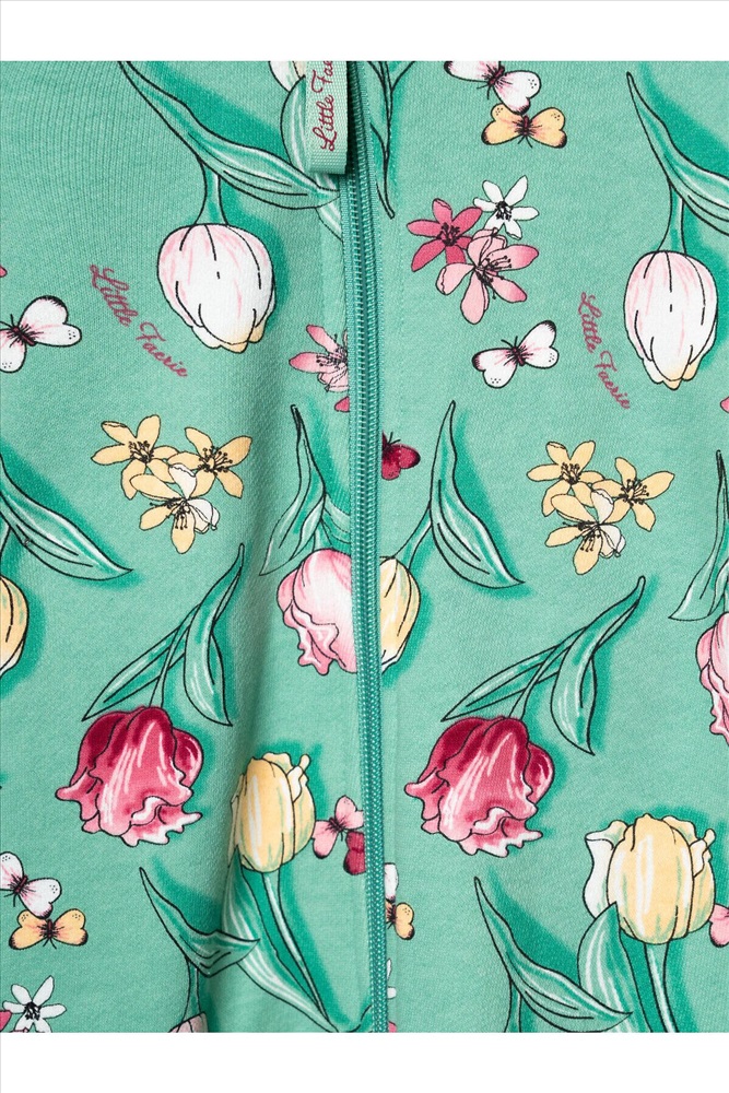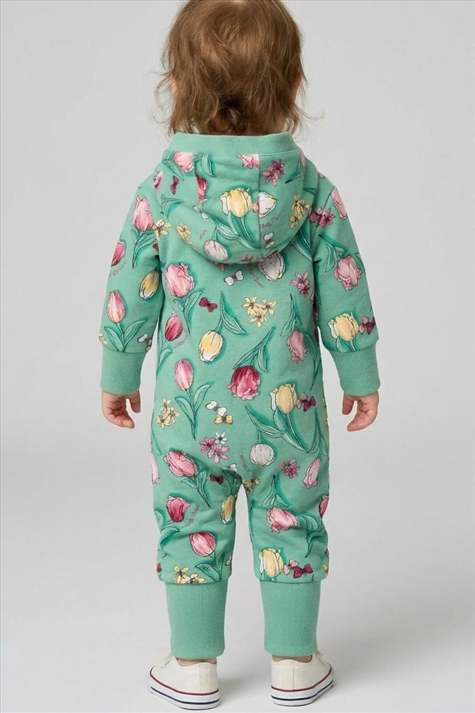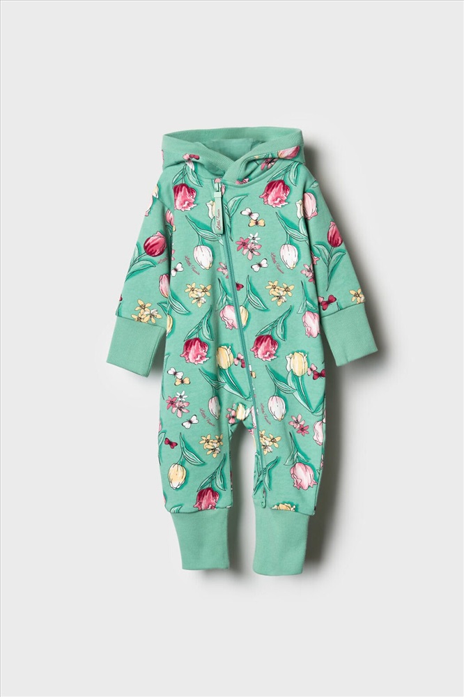 Комбинезон для новорождённой девочки. Модель с ножками и капюшоном, выполнен из мягкого футера из 100% хлопка. Цветочный принт с тюльпанами, бабочками. Комбинезон застёгивается на косую молнию спереди, что удобно при переодевании малыша. Манжеты на рукавах и брючинах выполнены из мягкого эластичного риба, обеспечивая комфортную посадку. Внутри капюшона — подкладка из джерси.