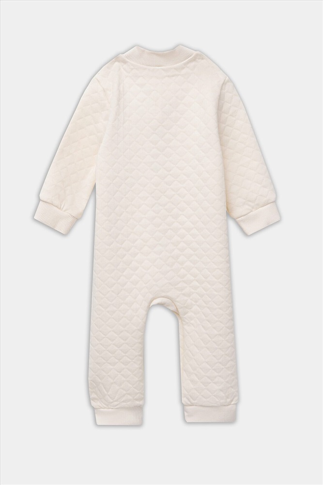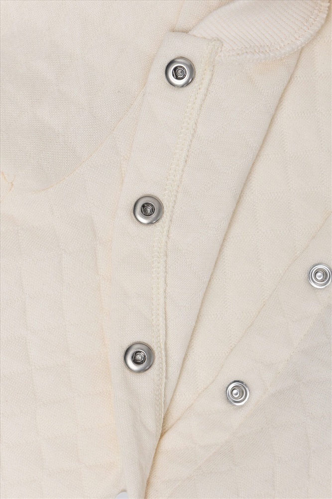 Комбинезон детский выполнен из капитона. Спинка цельнокроенная. Перед с застежкой от горловины до низа комбинезона. Застежка на кнопках - 6 шт (Кнопка ASB20L+486 пружин контакт, прорезин SOFT Touch-12,5 мм). Рукава втачные, длинные, одношовные. Горловина круглая, окантована бейкой из трикотажной рибаны 2*2 R-6, R22-062.01.360, 96% хлопок; 4% эластан, 360 гр/м?, 135 см. По низу рукавов и ножек притачные манжеты из трикотажной рибаны 2*2 R-6, R22-062.01.360, 96% хлопок; 4% эластан, 360 гр/м?, 135 см. По шаговому шву притачная ластовица.