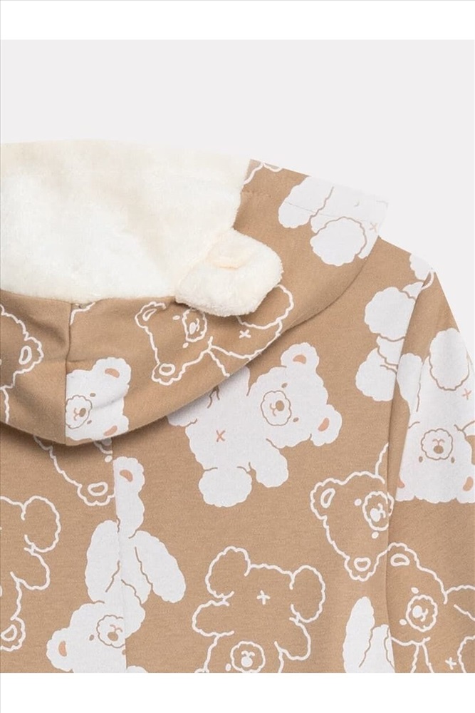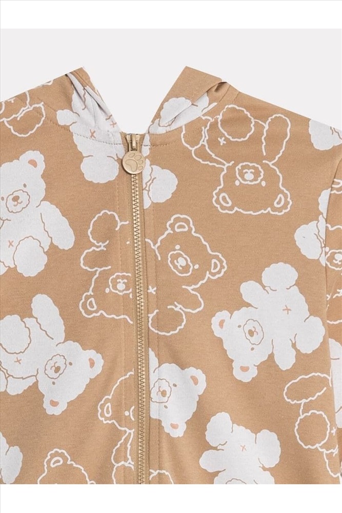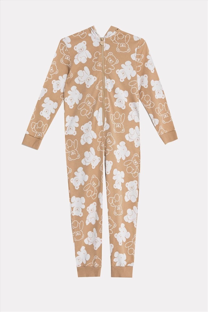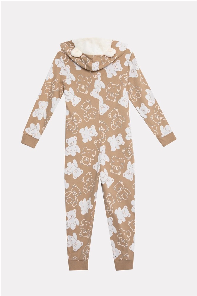 Комбинезон из трикотажного полотна интерлок. Силуэт свободный, на капюшоне – декоративные ушки из искусственного меха. Застегивается на центральную молнию. Рукава длинные, на манжетах из рибаны, как и штанины. Такой конфортный и очаровательный комбинезон, что ваша девочка не захочет его снимать!