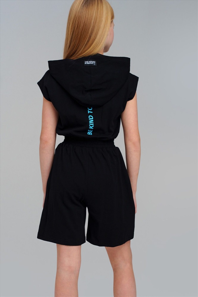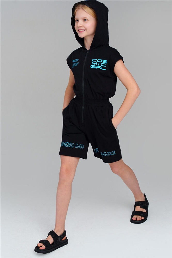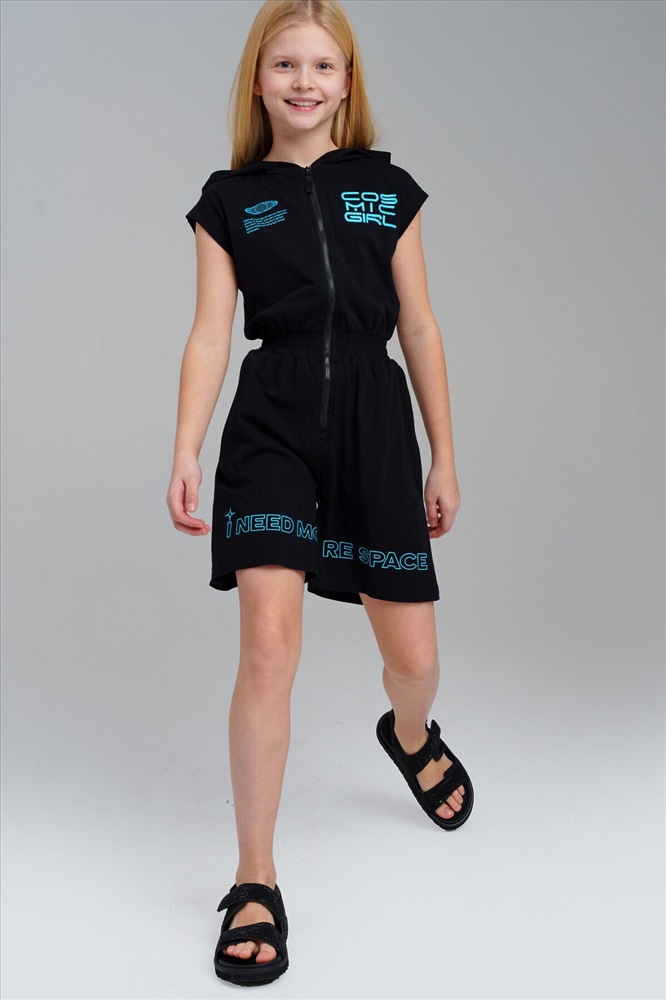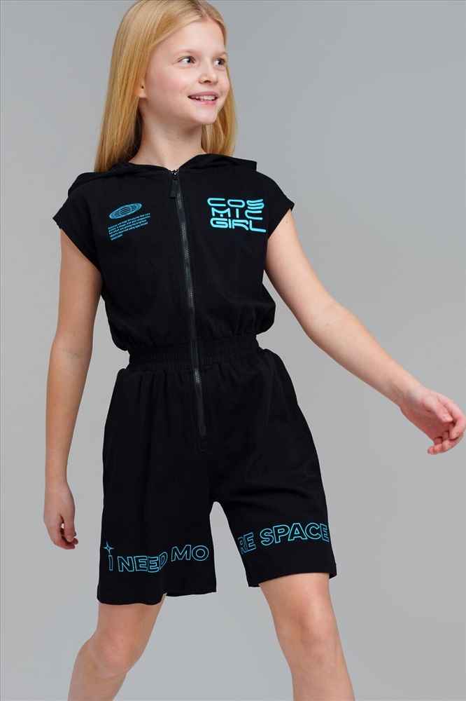 Комбинезон для девочки подростка. Пояс на резинке. Застежка на молнию. Функциональные боковые карманы. Высокое содержание хлопка 95%. Благодаря наличию эластана в составе ткани изделие держит форму и меньше мнется. Модель выполнена из качественного и приятного на ощупь трикотажа.