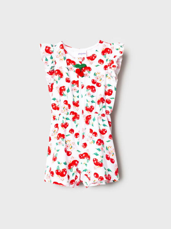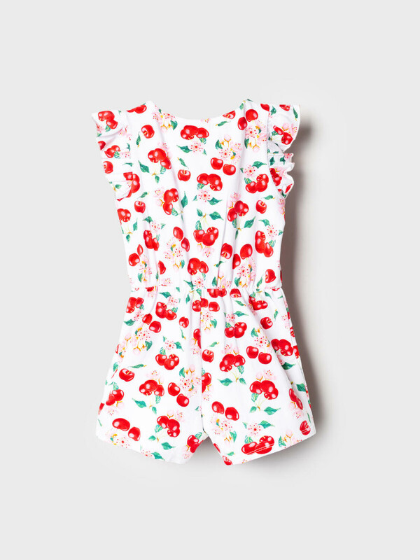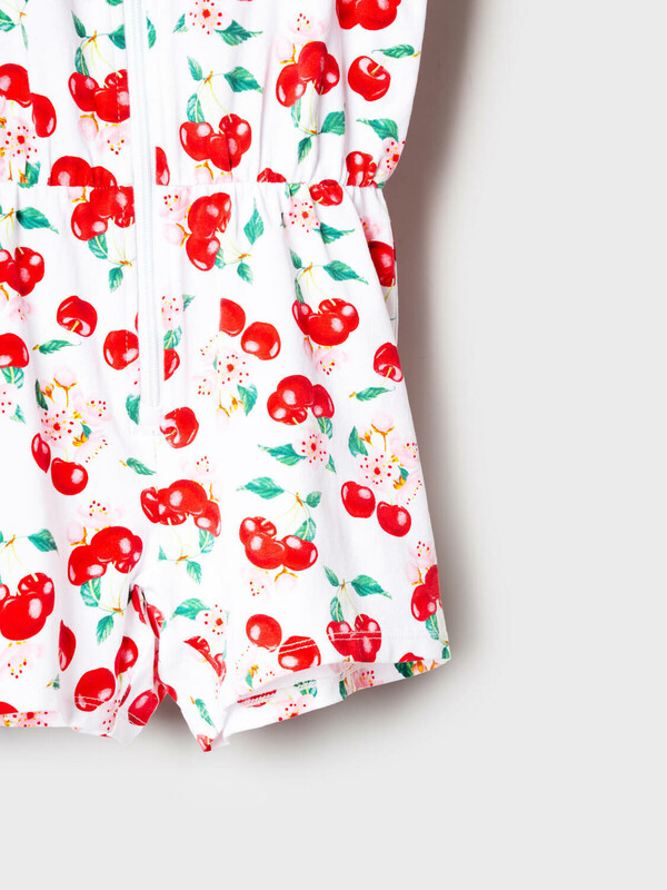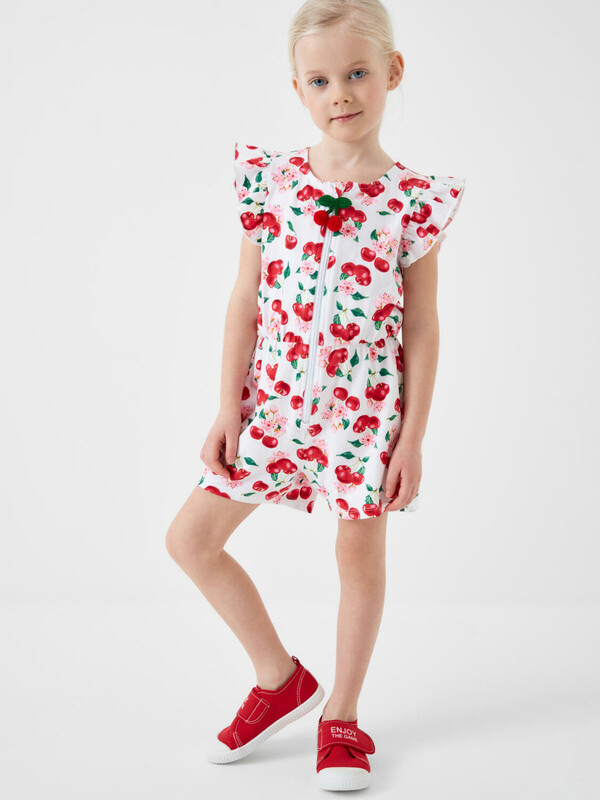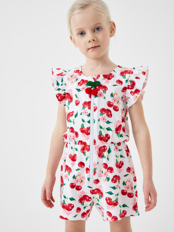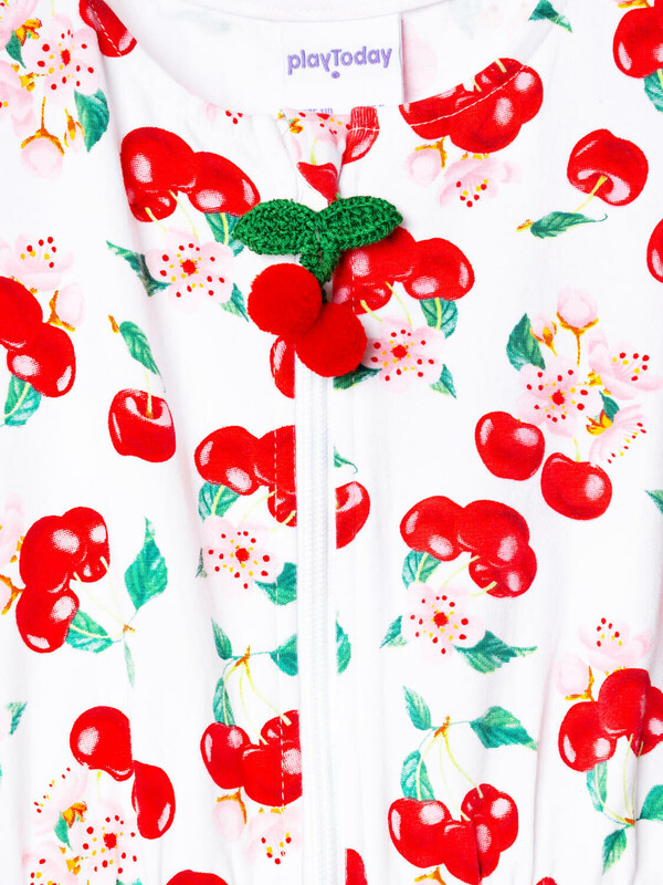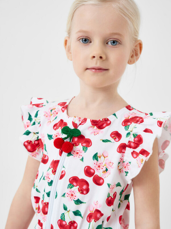 Лёгкий трикотажный комбинезон для девочки. Модель выполнена из хлопкового трикотажа джерси. Дизайн с ярким красочным принтом вишен, листьев и цветов. Рукава-крылышки. Застёжка-молния. На талии — мягкая резинка со шнурком для удобной посадки. Горловина круглая.