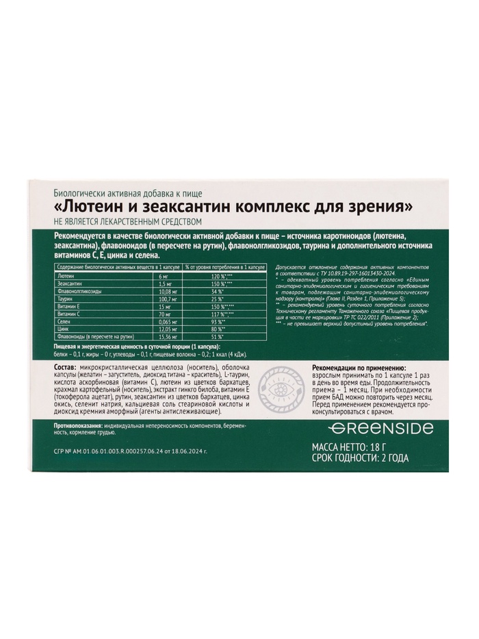 Габариты: 11 x 3 x 7,5 Страна: Россия В боксе: 25 шт Состав: См. на упаковке Материалы: см. на упаковке Фасовка: по 1 шт Индивидуальная упаковка: Картонная коробка / упаковка Сертификат: ЕАС Назначение: Для зрения Форма выпуска: Капсулы Показания: Нарушения зрения Компоненты: Лютеин, Зеаксантин Действие: Общеукрепляющее Лютеин и зеаксантин - основные компоненты антиоксидантной системы защиты глаза. В ходе эволюции в глазу сформировалась достаточно надежная система защиты от опасности фотоповреждения, основными компонентами которой являются каротиноиды. Среди всех каротиноидов только лютеин и зеаксантин обладают способностью проникать в сетчатку и эффективно защищать глаза. Такая защита необходима для обеспечения дневного зрения, а тем более зрения в условиях слишком яркой или опасной по спектральному составу световой среды. Активные компоненты: Лютеин и Зеаксантин - это каротиноиды, который является одним из основных пигментов, защищающий глаза от фотоповреждения. L-таурин - улучшает условия проведения нервного импульса, обладает противовоспалительным эффектом. Гингко билоба - понижение внутриглазного давления и улучшение зрительных функций. Витамин Е - участник метаболизма клеток, белкового обмена, является антиоксидантом. Способствует благоприятному влиянию на сетчатку глаза. Витамин С - является антиоксидантом, который помогает сохранить активность глазодвигательных мышц, зрительного нерва и поддержанию необходимой концентрации коллагена в оптических структурах глаза. Комментарии к товару