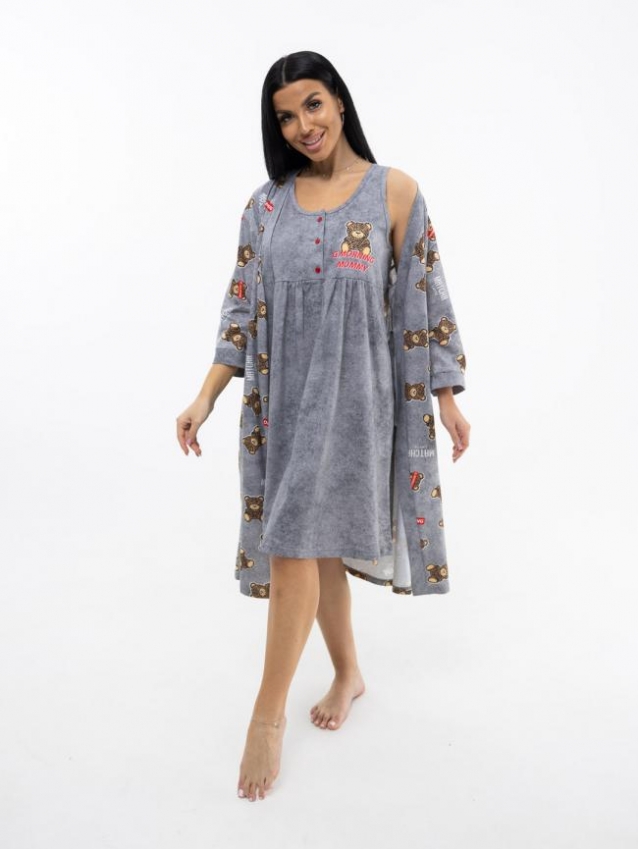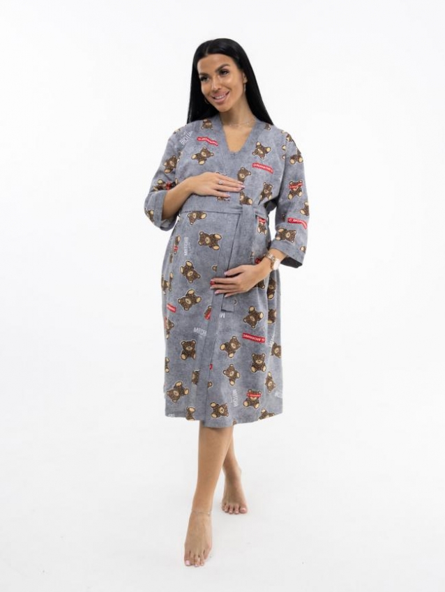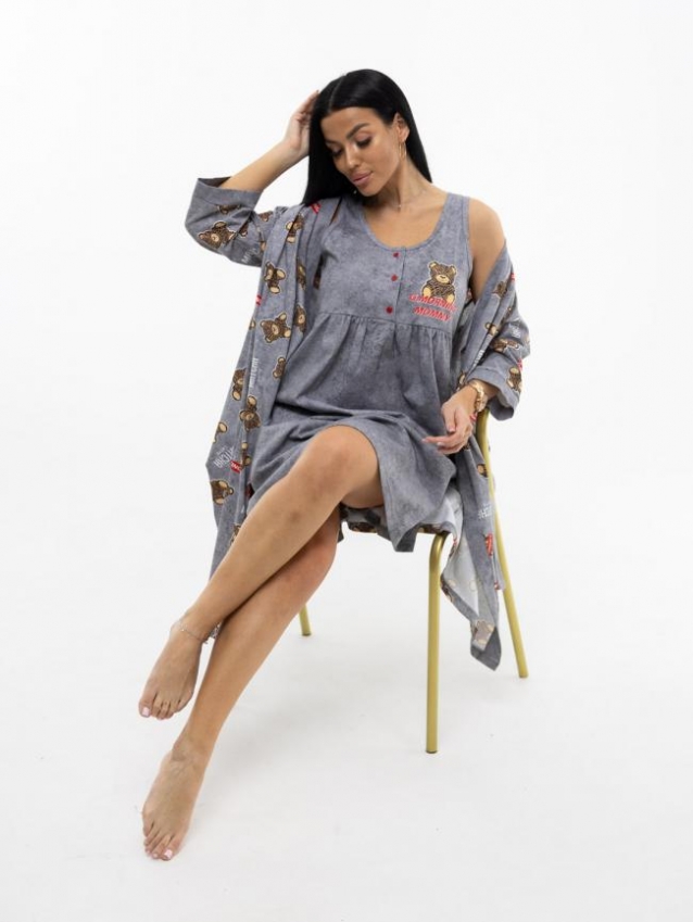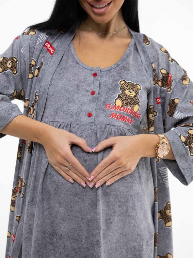 Представляем вам идеальный домашний комплект из 100% хлопка — мягкий и стильный халат с сорочкой для беременных, специально созданный для вашего комфорта. Комплект сочетает в себе элегантность и удобство, что делает его идеальным вариантом как для повседневного ношения, так и для особых моментов, таких как пребывание в роддоме. Халат на запах с длинным поясом-кушаком и карманами в боковых швах. Ночная сорочка с кокеткой на пуговицах, стильной печатью и складками спереди, для комфортного расположения животикка.