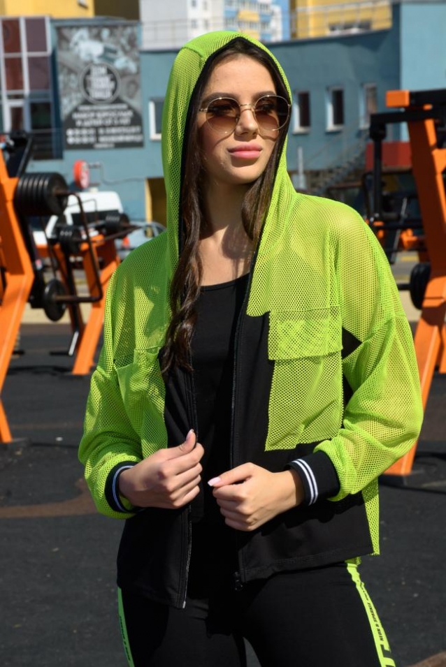 Комплект состоит из толстовки и майки. Толстовка прямая, свободная, с капюшоном из сетки, на молнии. Рукав длинный, из сетки, на эластичном манжете. Спинка удлиненная, из сетки. В верхней части полочки расположены кокетки из сетки. На полочку настрочены накладные карманы с клапанами из сетки. Майка на бретелях, полуприлегающая.