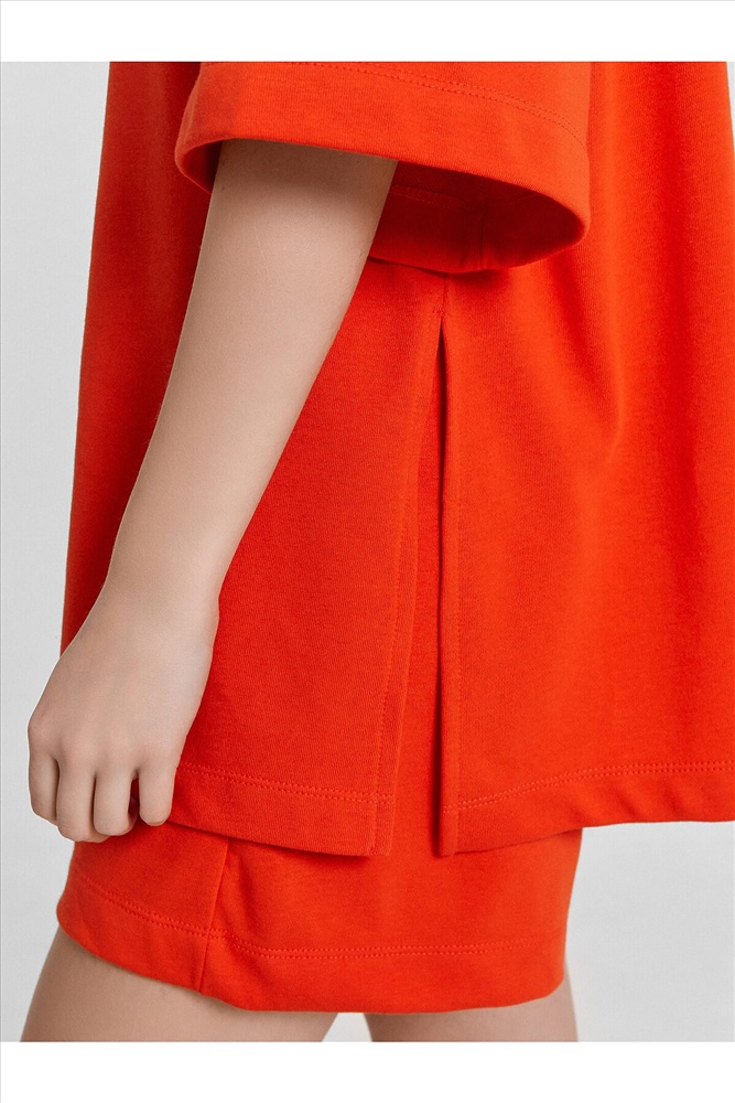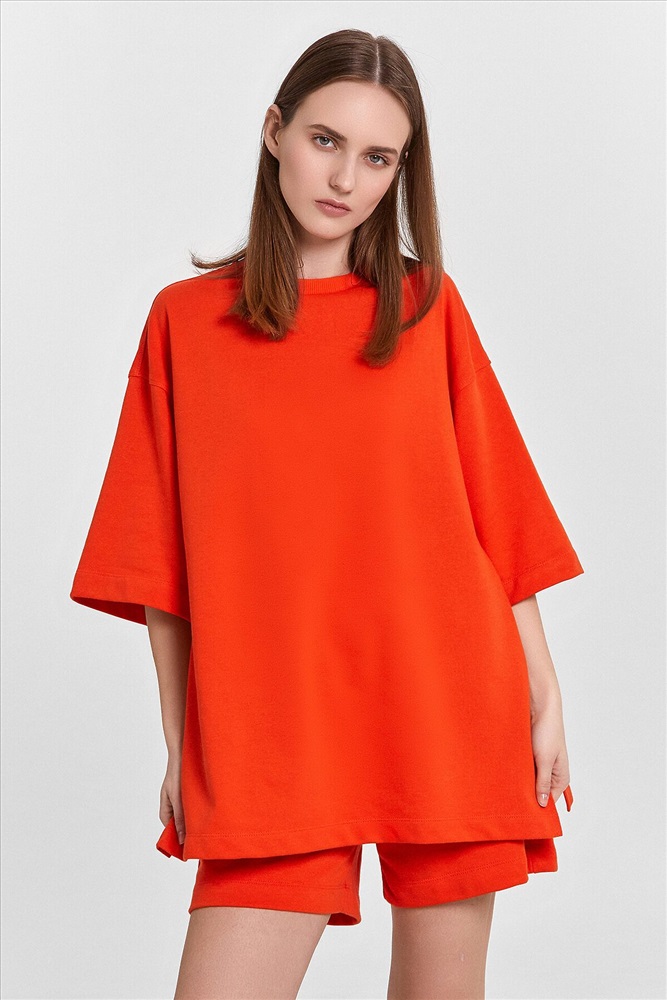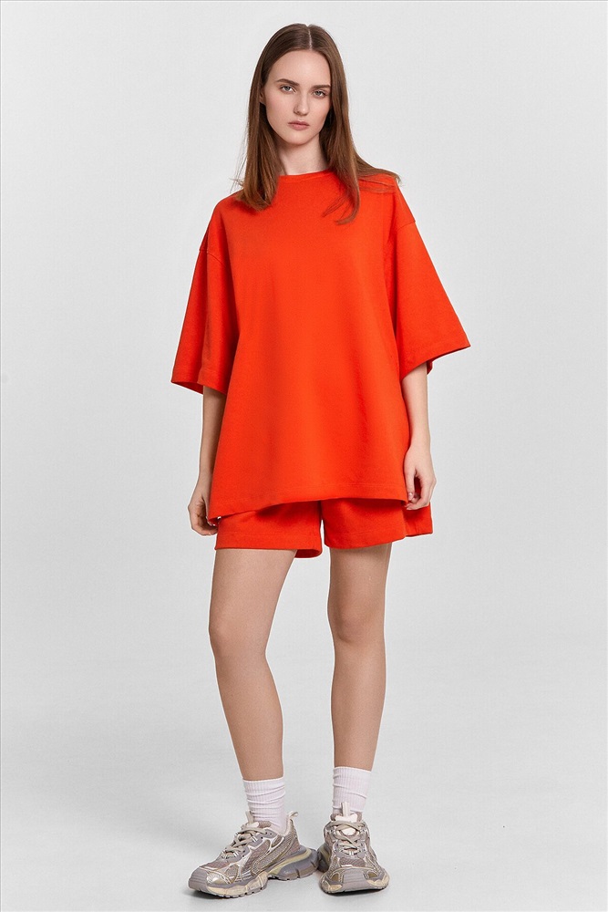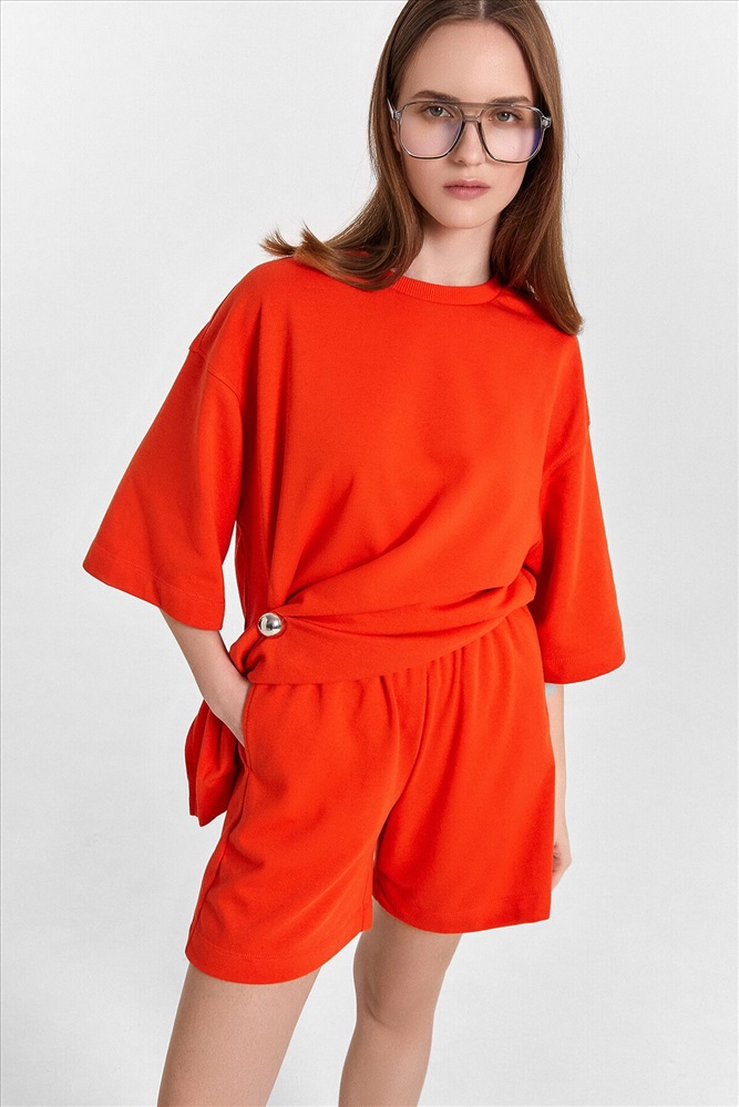 Блуза женская свободного силуэта из трикотажного полотна футер. Горловина круглой формы, обтачка горловины из рибаны. Шов горловины спинки закрыт хб тесьмой. Плечо спущено, пройма углублена, рукав втачной удлиненный. По плечу и пройме проложены отделочные строчки. Блуза удлинена, с разрезами в боковых швах. Шорты женские свободного силуэта из трикотажного полотна футер. Пояс цельнокроеный с эластичной тесьмой внутри. На внутренней стороне пояса пробиты петли и вставлен шнур 10мм, (ШНУР 10PX-1). В боковых швах обработаны карманы. Нижние срезы шорт обработаны швом вподгибку.