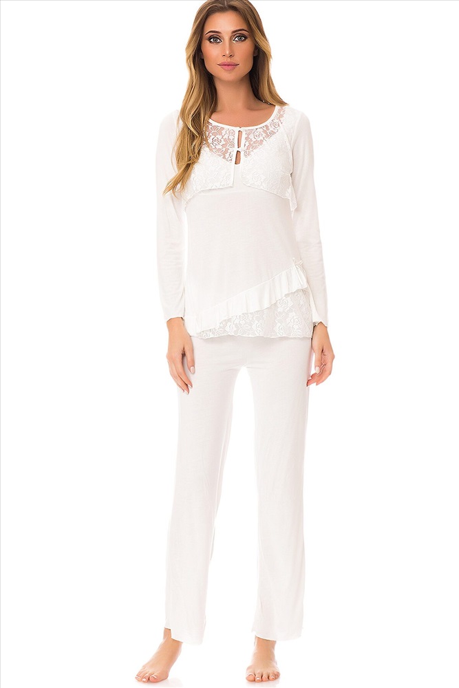 Комплект из трикотажных брюк и джемпера с длинным рукавом и округлым вырезом горловины.
